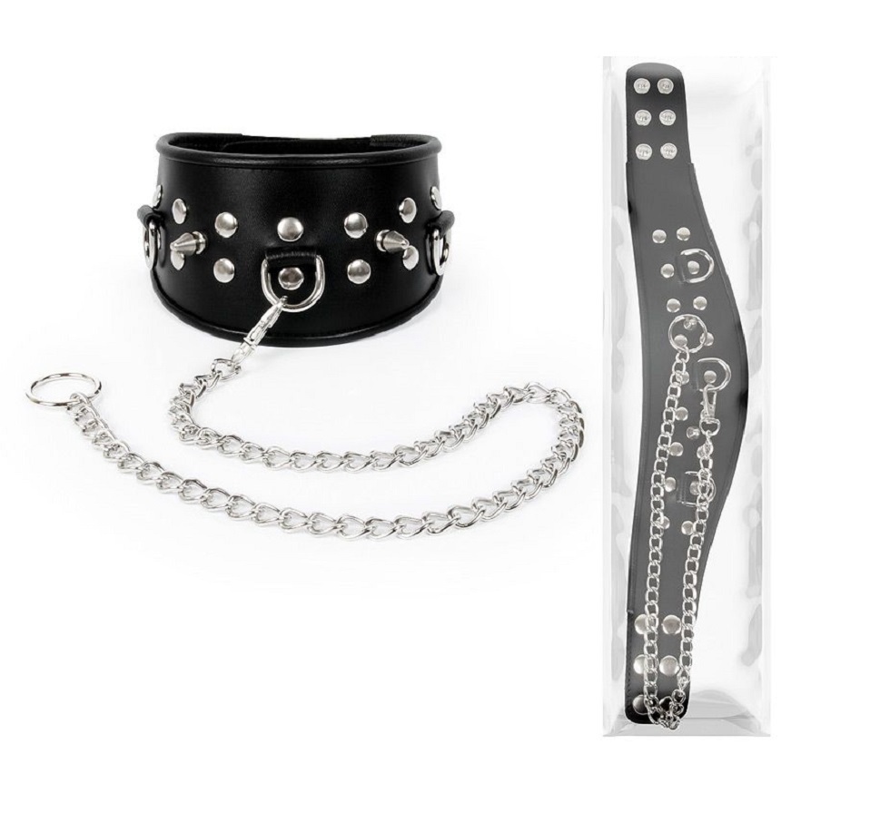 Ошейник с шипами и цепью, регулируемый, черный, для БДСМ-практик