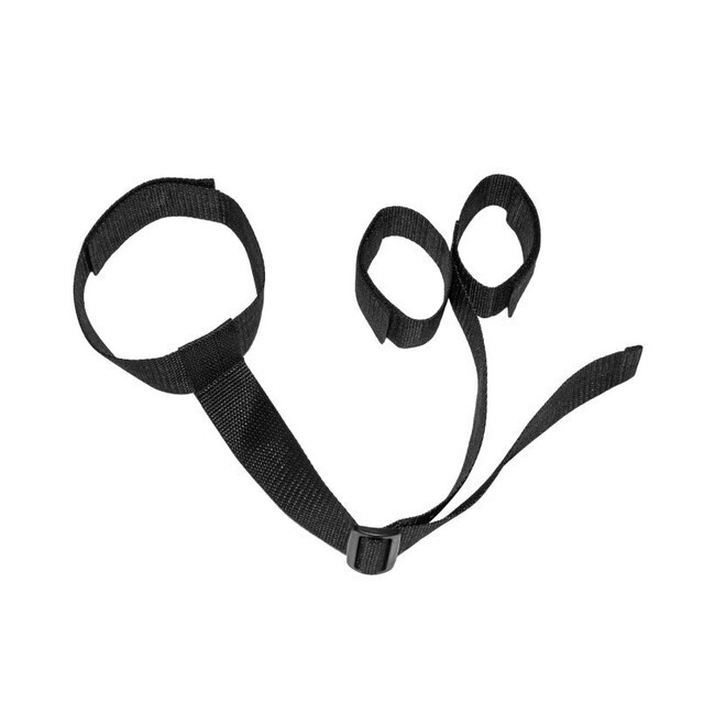 Ошейник легко фиксируется на шее при помощи надежной застежки. Наручники соединяются с ошейником специальными креплениями, которые позволяют регулировать длину подвеса. Подходит как для мужчин, так и для женщин.