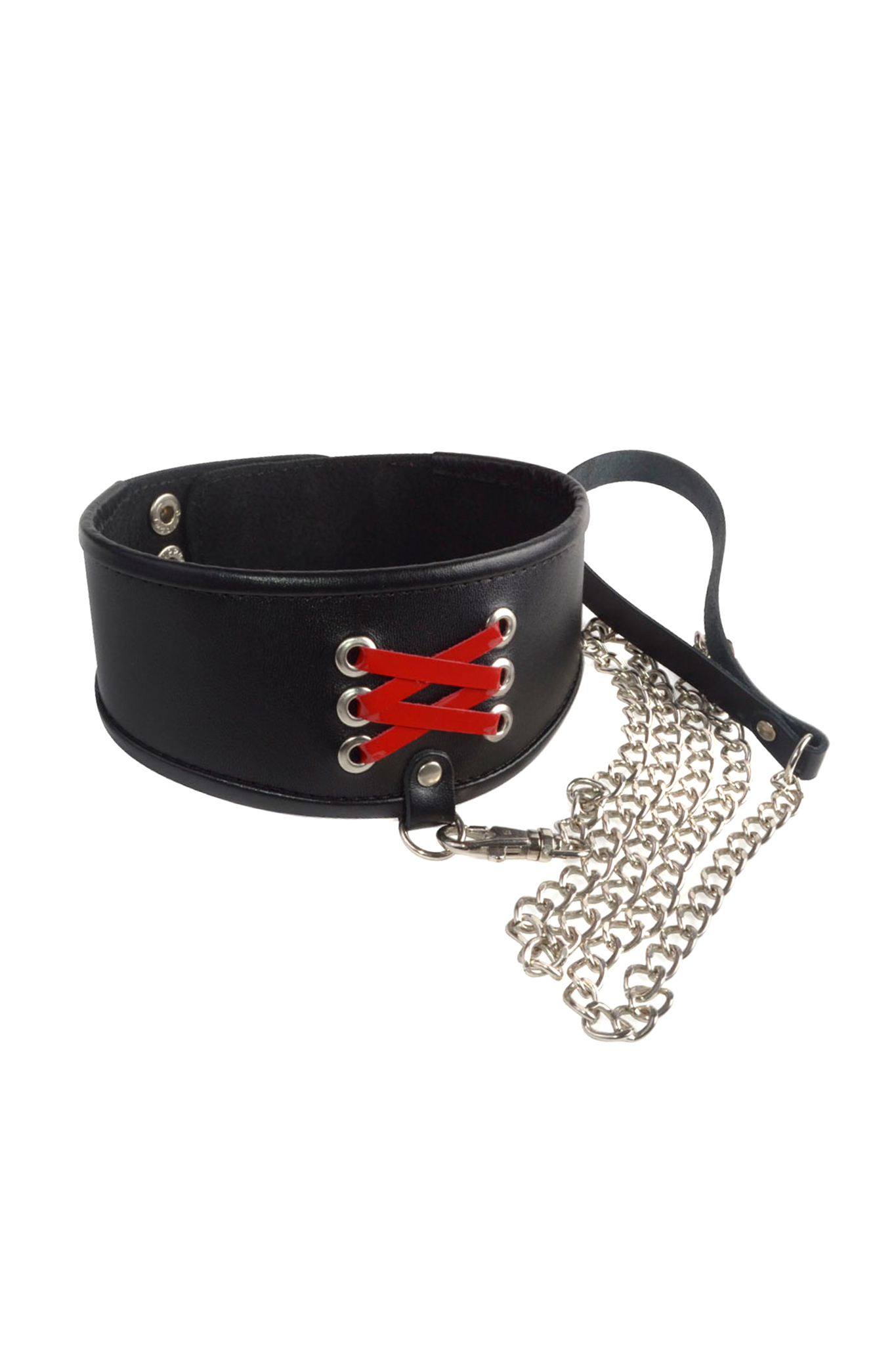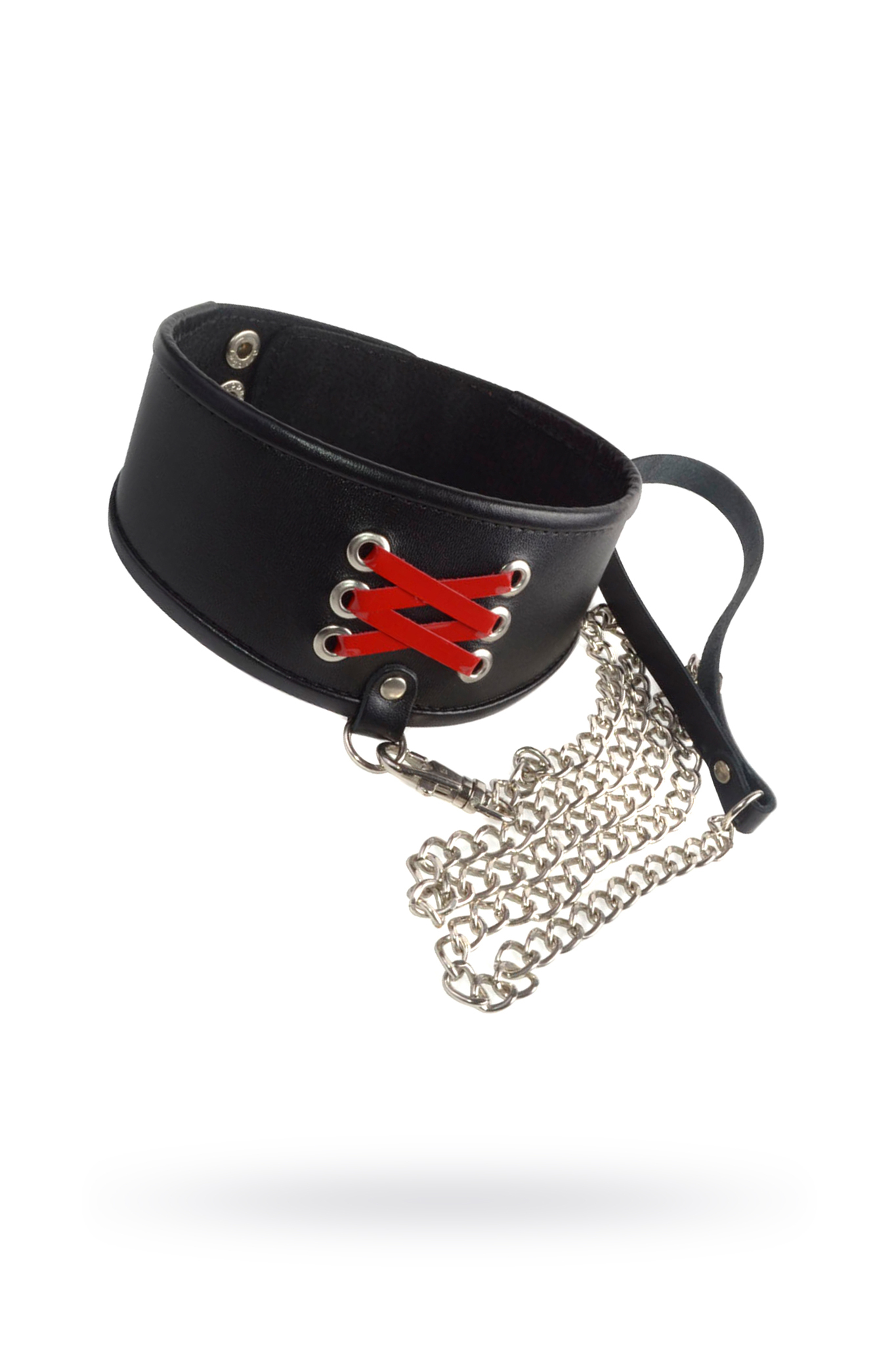 В комплект входит цепочка-поводок длиной около 1 метра, с карабином для крепления к металлическим кольцам на ошейнике и кожаным ремешком-петлей, который можно использовать как ручку или для фиксации на запястье. Это обеспечивает надежное удержание партнера на нужном расстоянии и добавляет элемент эстетики и практичности.