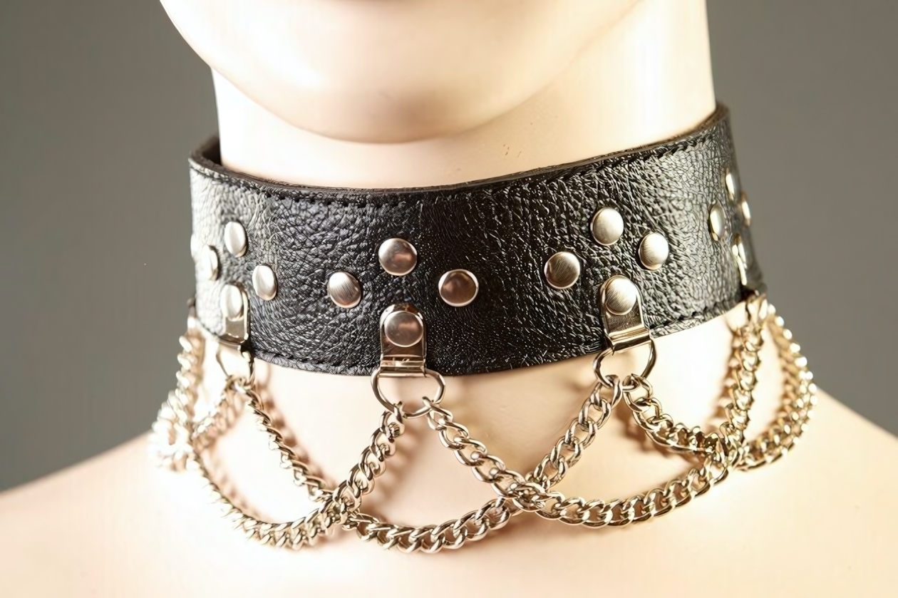 Черный кожаный ошейник с эффектными металлическими цепочками подчеркнет вашу индивидуальность и добавит нотку дерзости в любой образ. Изделие сочетает в себе комфорт, элегантный дизайн и надежность.