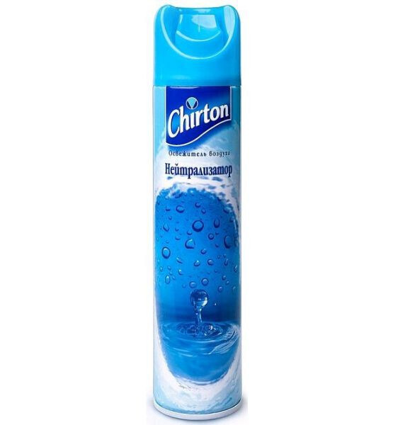 Объем: 300 мл. Упаковка выполнена из металла, что обеспечивает надежность и долговечность. Основной цвет упаковки – голубой, с ярким логотипом CHIRTON, который подчеркивает свежесть и чистоту. Освежитель имеет цилиндрическую форму, что делает его удобным для хранения и использования.