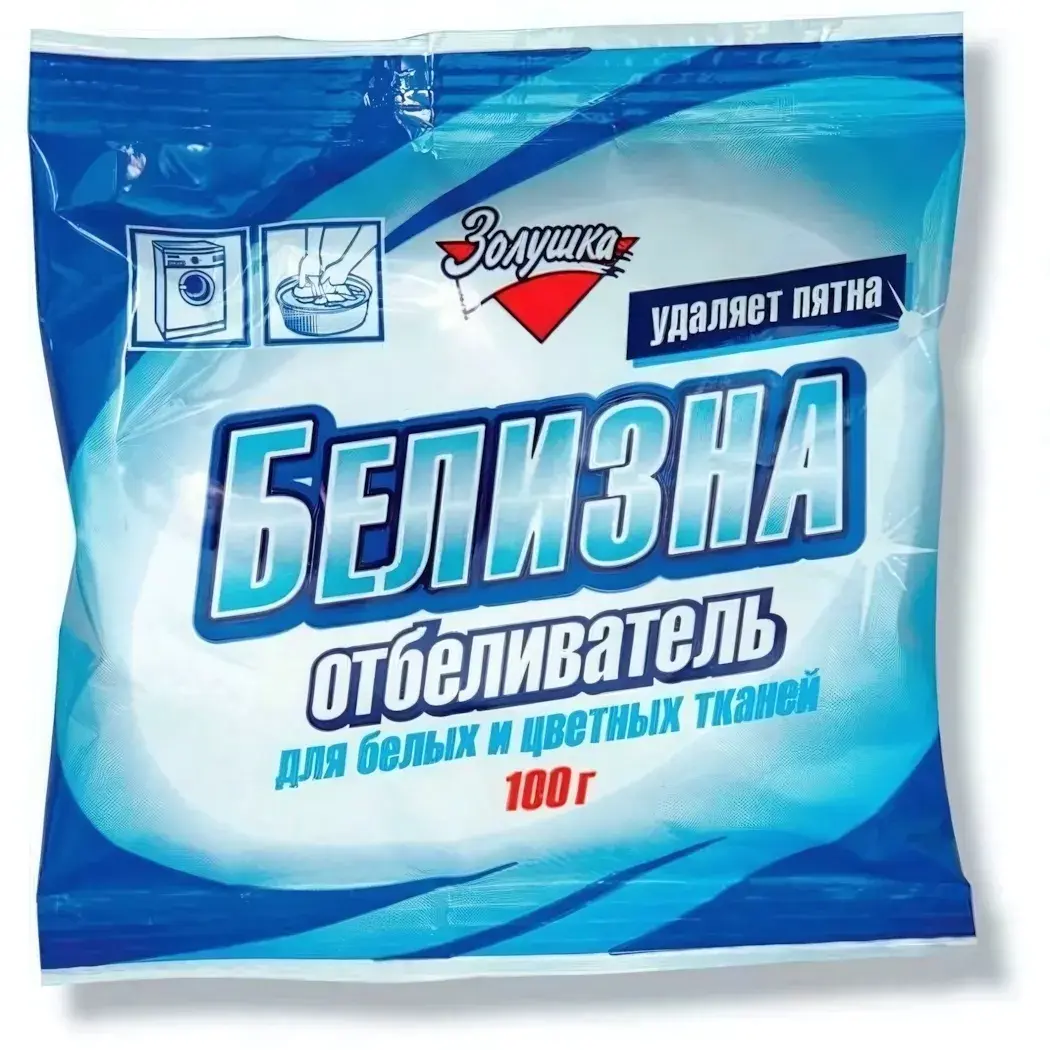 Упаковка отбеливателя "Белизна" выполнена в ярких синих и белых тонах, что делает ее заметной на полке. Продукт представлен в удобном пакете объемом 100 граммов, что позволяет использовать его в течение длительного времени. На упаковке также указаны способы применения, что делает его использование еще более простым и понятным.