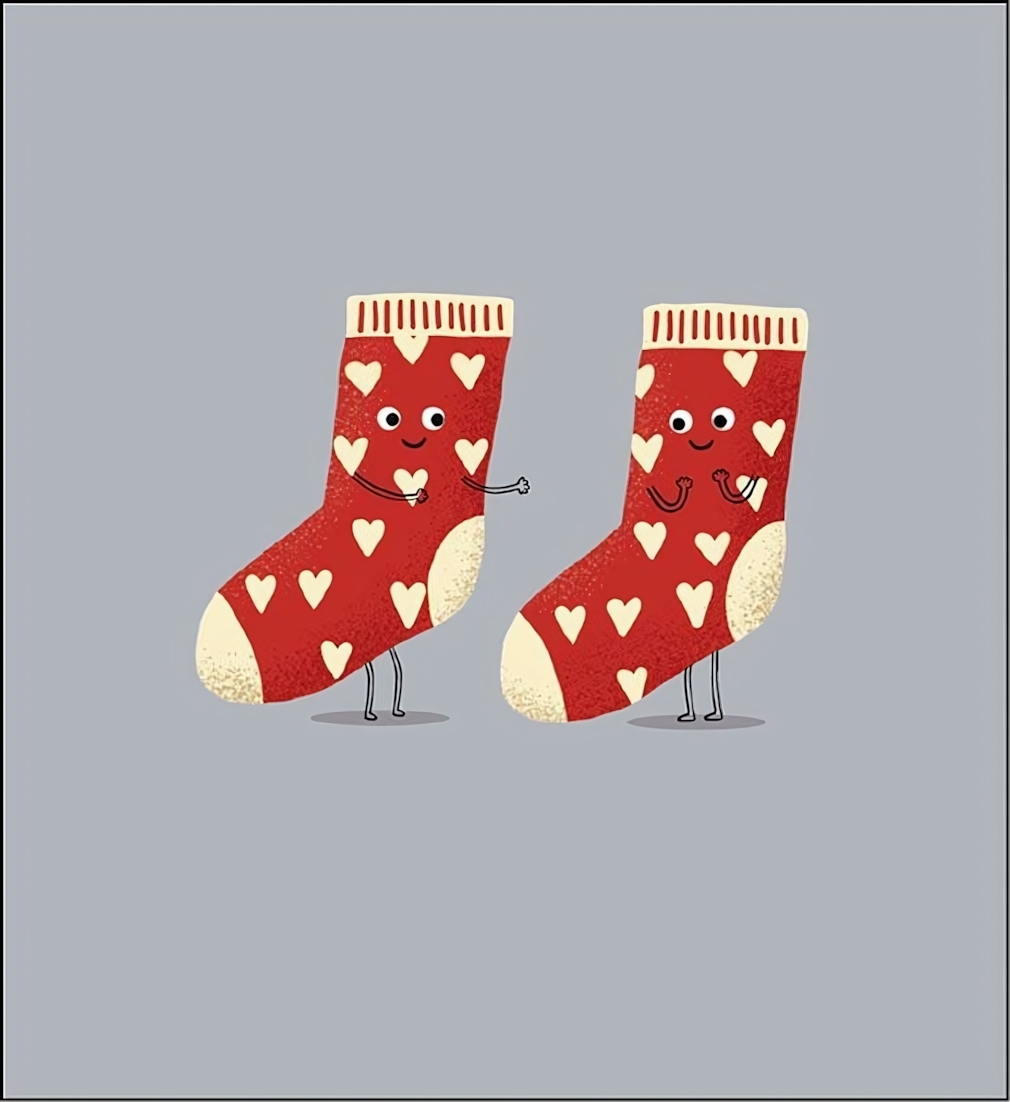 Эта оригинальная поздравительная открытка формата 121х183 мм с милым изображением красных носков в мультяшном стиле станет забавным и трогательным способом передать теплые чувства. Забавные персонажи с улыбками и сердечками создают атмосферу уюта и радости, а компактный размер позволяет легко вложить открытку в подарок или отправить по почте.
