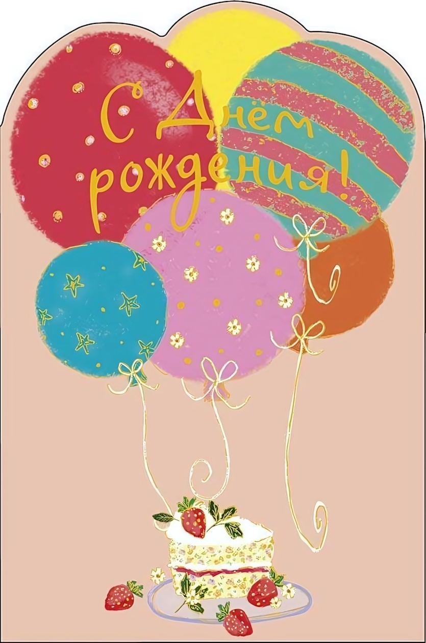 Подарите своим близким радость и улыбки с помощью нашей открытки 'С Днем Рождения!'. Эта открытка станет отличным дополнением к любому подарку и создаст праздничное настроение. Яркие цвета и праздничный дизайн с воздушными шарами и тортом привлекут внимание и поднимут настроение имениннику.