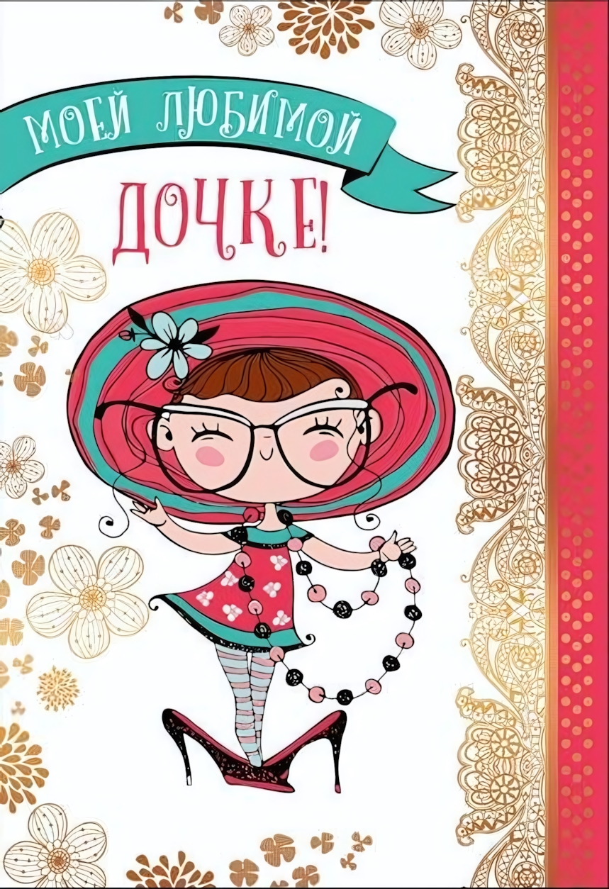 Выбирая эту открытку, вы получаете не просто бумагу с надписью, а уникальный дизайнерский продукт, который выделяется среди обычных открыток. Яркие цвета и оригинальный рисунок с мультяшным персонажем, девочкой с большими очками, создают позитивное настроение и радость. Открытка оформлена с использованием декоративных элементов, таких как цветы и золотые узоры, что делает ее по-настоящему особенной.