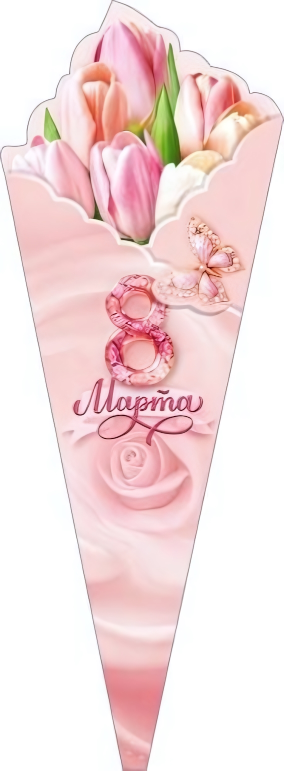 Открытка выполнена в формате А4 и имеет размер 330х120 мм. Фигурная вырубка в виде удлинённого конуса придаёт изделию оригинальный внешний вид и помогает сохранять аккуратную форму при хранении и транспортировке. Лицевая сторона украшена стилизованной цифрой «8», изображением тюльпанов и бабочки в нежной цветовой гамме.