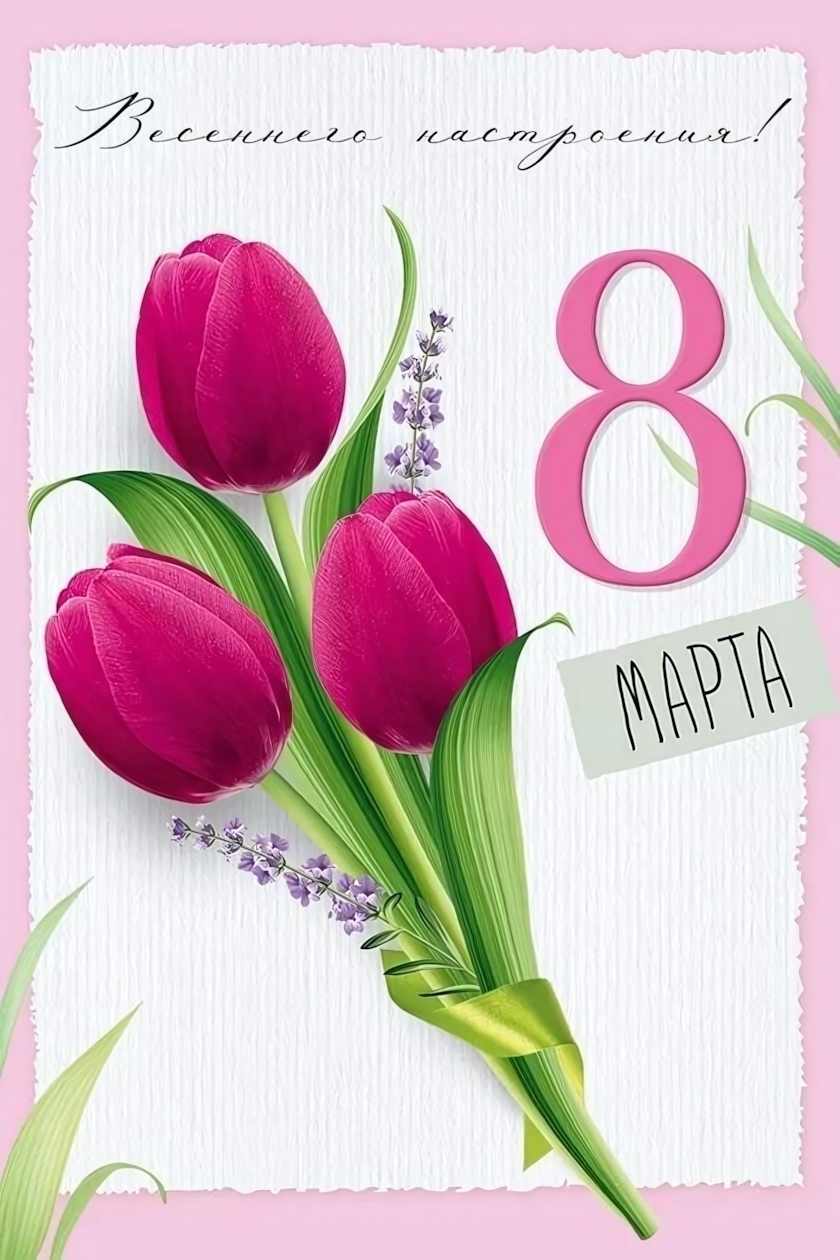 Эта открытка выделяется своим уникальным дизайном, который включает в себя ярко-розовые тюльпаны и элементы лавандового цвета. Она выполнена на качественной текстурированной бумаге, что придаёт ей особую элегантность. Надписи, выполненные изящным шрифтом, добавляют открытке индивидуальности и тепла.