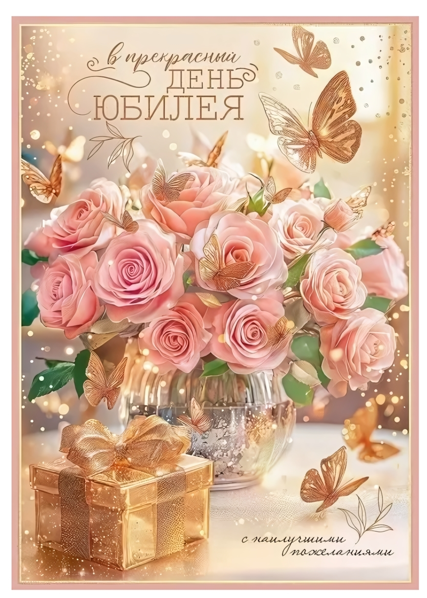 Открытка в формате А4 'В прекрасный день Юбилея' — это не просто красивое поздравление, а настоящая находка для тех, кто ценит стиль и атмосферу праздника. Искусно оформленный дизайн с изображениями розовых роз и бабочек в сочетании с золотыми блестками создаёт неповторимую романтическую атмосферу, которая порадует юбиляршу в её особенный день.