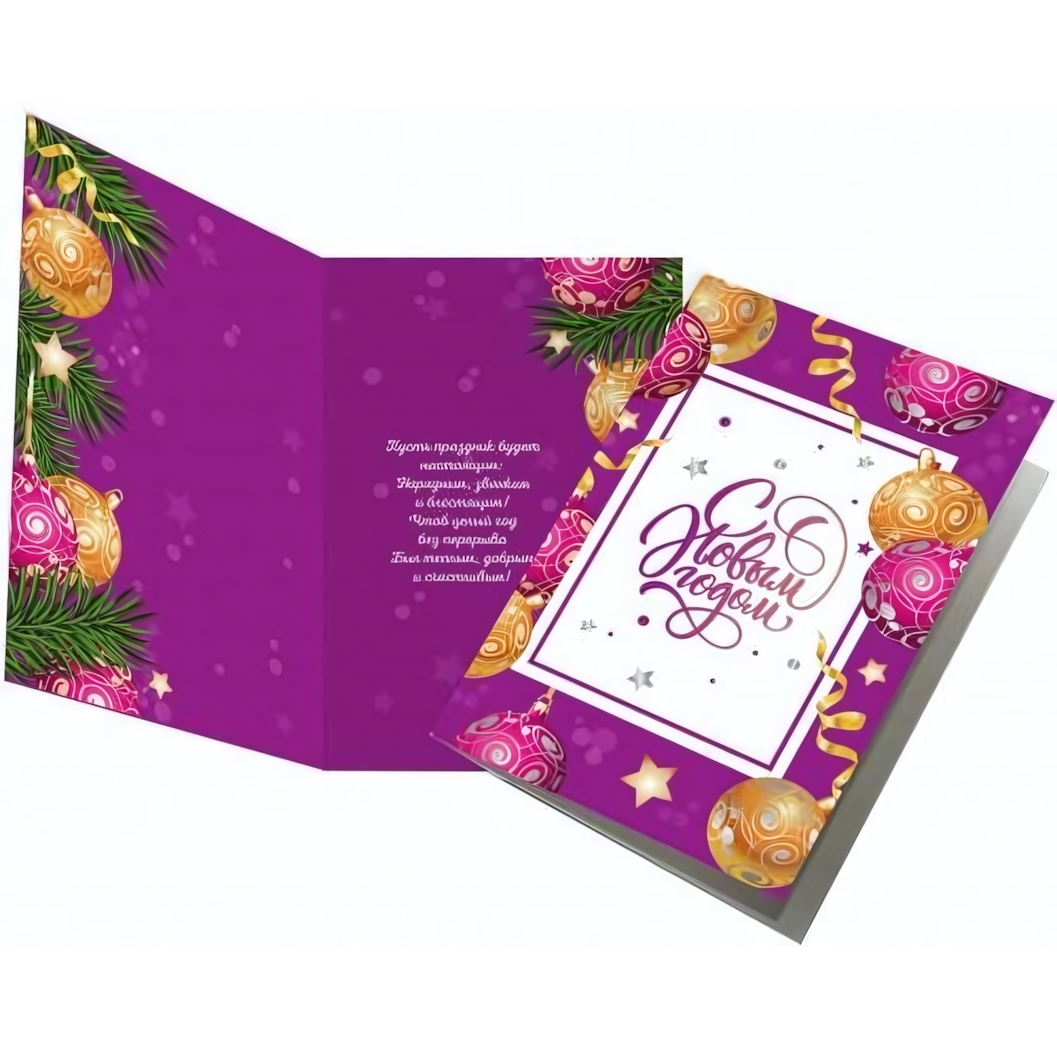 Эта изысканная открытка станет прекрасным дополнением к вашему подарку и подарит получателю тепло и радость в новогодние праздники. Яркий фиолетовый фон, украшенный золотыми и розовыми новогодними игрушками, создаст атмосферу волшебства и праздника.