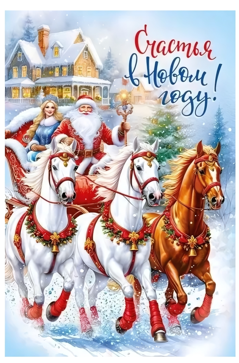 Эта красивая открытка формата А5 с радужными блестками в лаке создаст атмосферу тепла и радости в момент вручения. На её лицевой стороне изображен зимний сюжет: Дед Мороз и Снегурочка рядом с украшенными лошадьми, заснеженным домом и мягким сиянием огней, что делает поздравление особенно душевным и ярким.