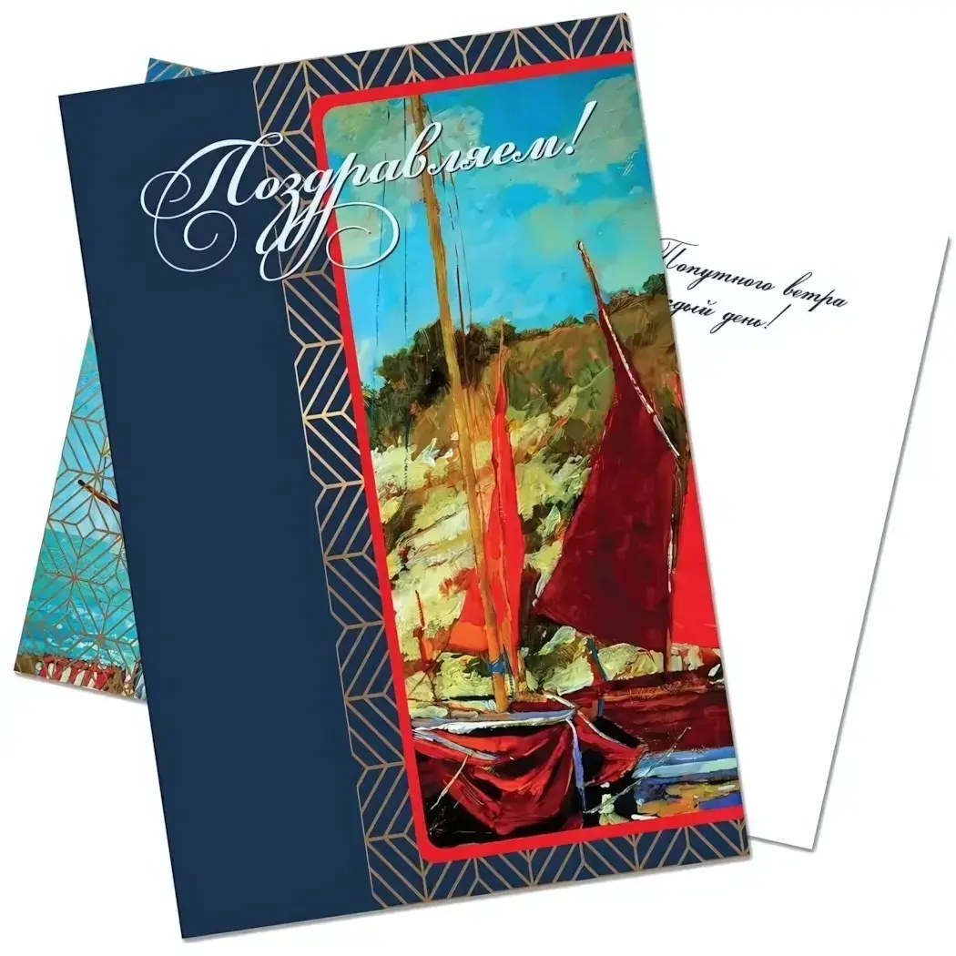 Подарите близким искренние эмоции с помощью стильной открытки формата А5. Красочные парусники на фоне лазурного неба создают атмосферу праздника и свободы.