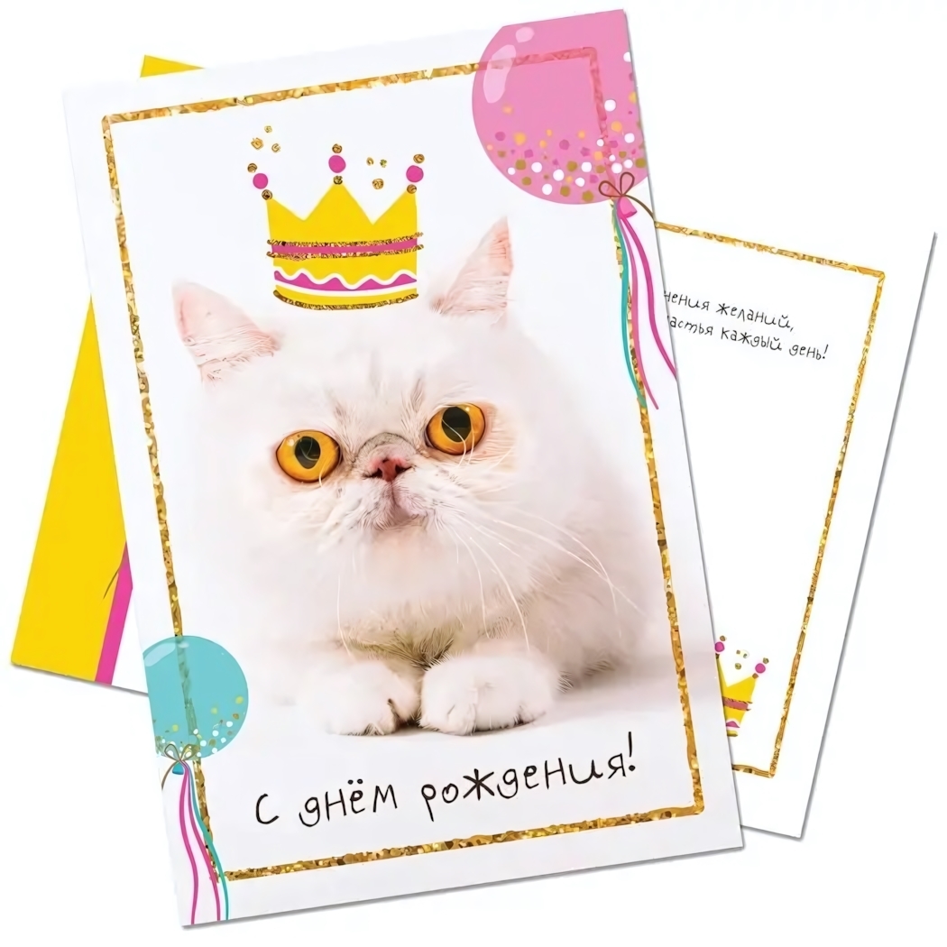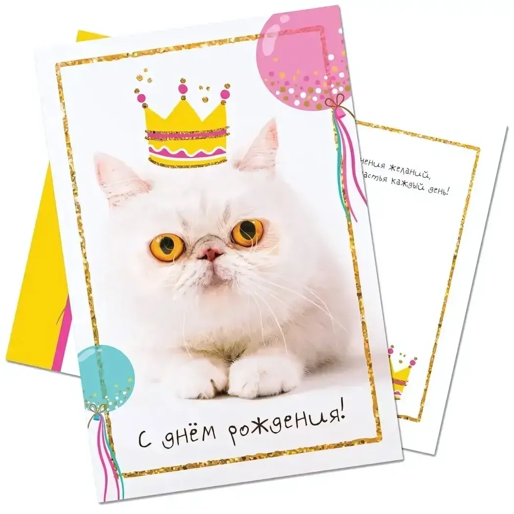 Лицевая сторона украшена контрастной композицией: белый кот с выразительными глазами на фоне золотого тиснения. Воздушные шары в пастельных тонах и объемная корона создают эффект трехмерности. Внутреннее пространство разделено на зону для текста и готовое поздравление.