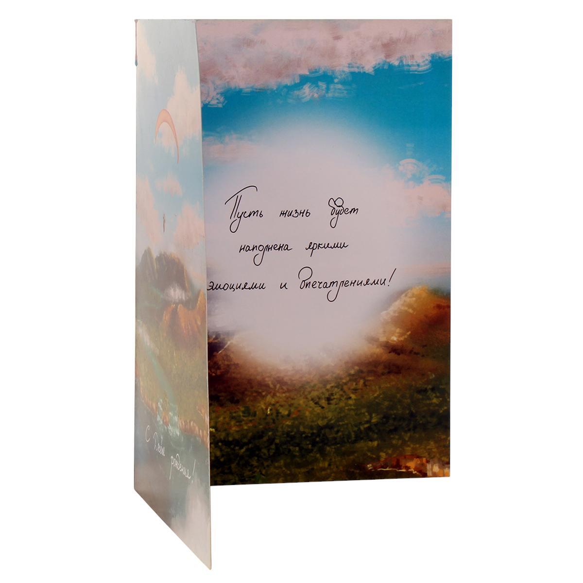Подарите радость и положительные эмоции с нашей яркой открыткой 'С Днём Рождения!'. Эта открытка станет отличным дополнением к любому подарку и создаст атмосферу праздника. Яркие цвета и оригинальный дизайн с изображением парапланериста на фоне живописного горного пейзажа привлекут внимание и поднимут настроение имениннику.