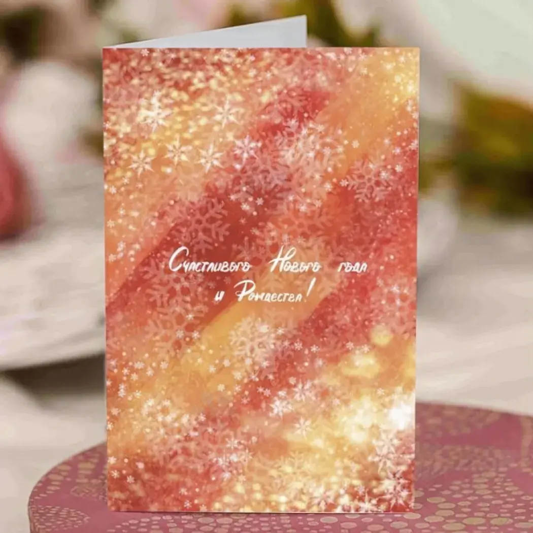 Дизайнерская открытка на плотном картоне премиального качества станет трогательным дополнением к новогоднему поздравлению. Теплые оттенки оранжевого и золота создают атмосферу уюта, а изящные снежинки с текстурным тиснением добавляют зимнего очарования.