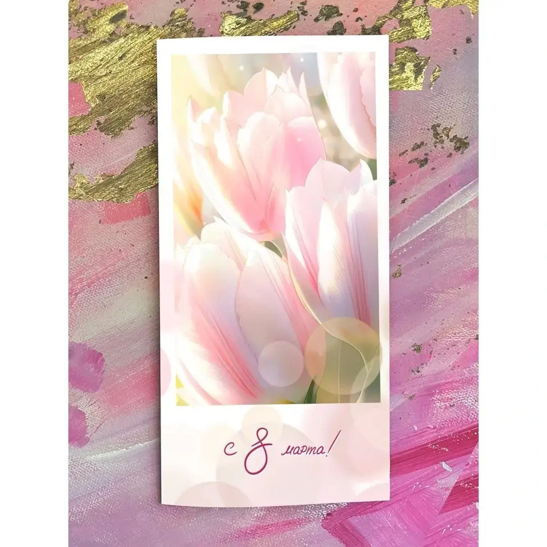 Подарите своим близким тепло и заботу с этой изысканной открыткой, которая станет идеальным дополнением к любому подарку. Нежные белые тюльпаны на фоне пастельных оттенков создают атмосферу праздника и радости. Открытка выполнена из качественного картона, что гарантирует долговечность и сохранность ваших поздравлений.