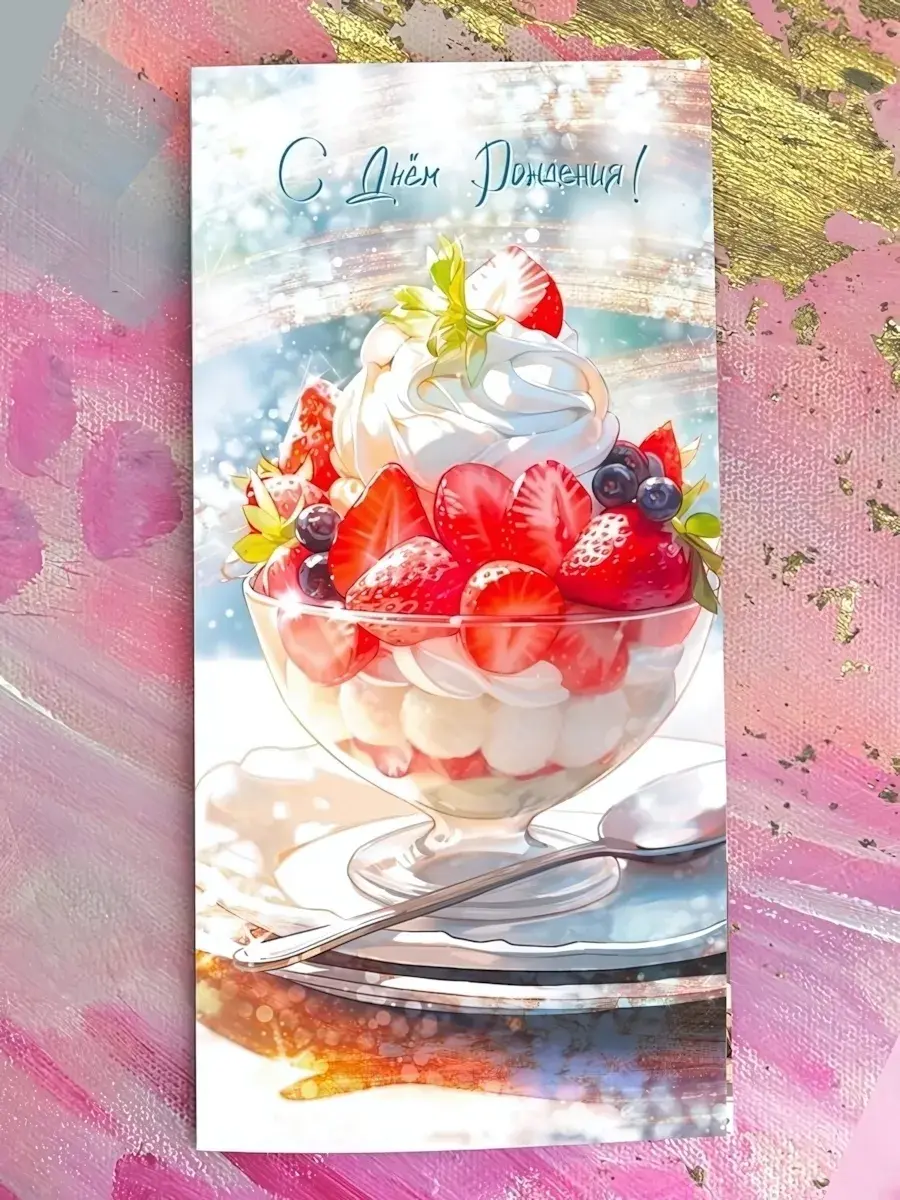 Подарите радость и тепло своим близким с помощью этой великолепной открытки, оформленной в стиле клубничного десерта. Яркие цвета и аппетитный дизайн создают атмосферу праздника и поднимают настроение. Открытка станет отличным дополнением к любому подарку и поможет выразить ваши искренние чувства.
