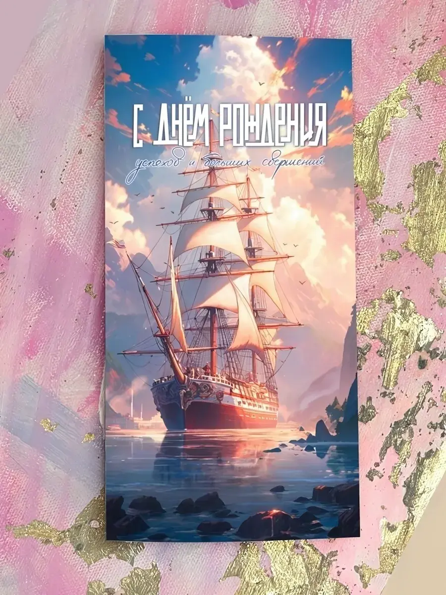 Открытка отличается высоким качеством печати и проработанными деталями: от четкой передачи цветов до детализированного изображения парусника. Пастельные тона создают нежное праздничное настроение, а качественная бумага обеспечивает долговечность.