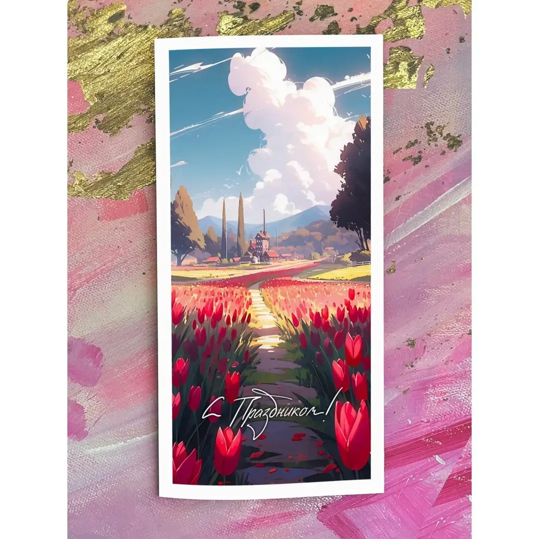Подарите радость и тепло своим близким с помощью этой великолепной открытки, украшенной яркими тюльпанами. Она станет идеальным дополнением к любому празднику, добавляя нотку весеннего настроения и ярких красок в ваш подарок. Открытка выполнена из качественного картона, что гарантирует её долговечность и сохранность в течение долгого времени.