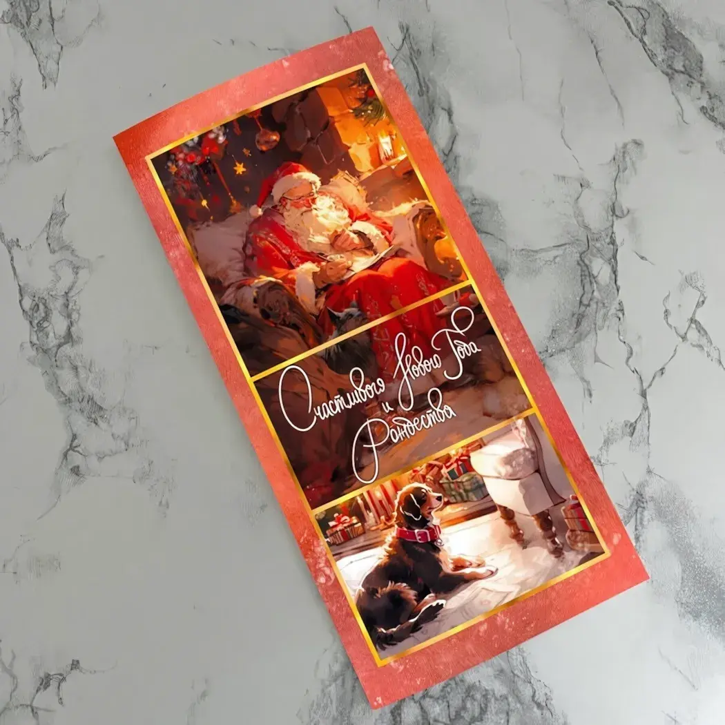 Размер открытки соответствует стандарту Евро, что делает ее удобной для хранения и отправки. Изготовлена из прочного картона, что гарантирует долговечность и сохранность. Открытка оформлена в красных и золотых тонах, что делает ее особенно праздничной и привлекательной.
