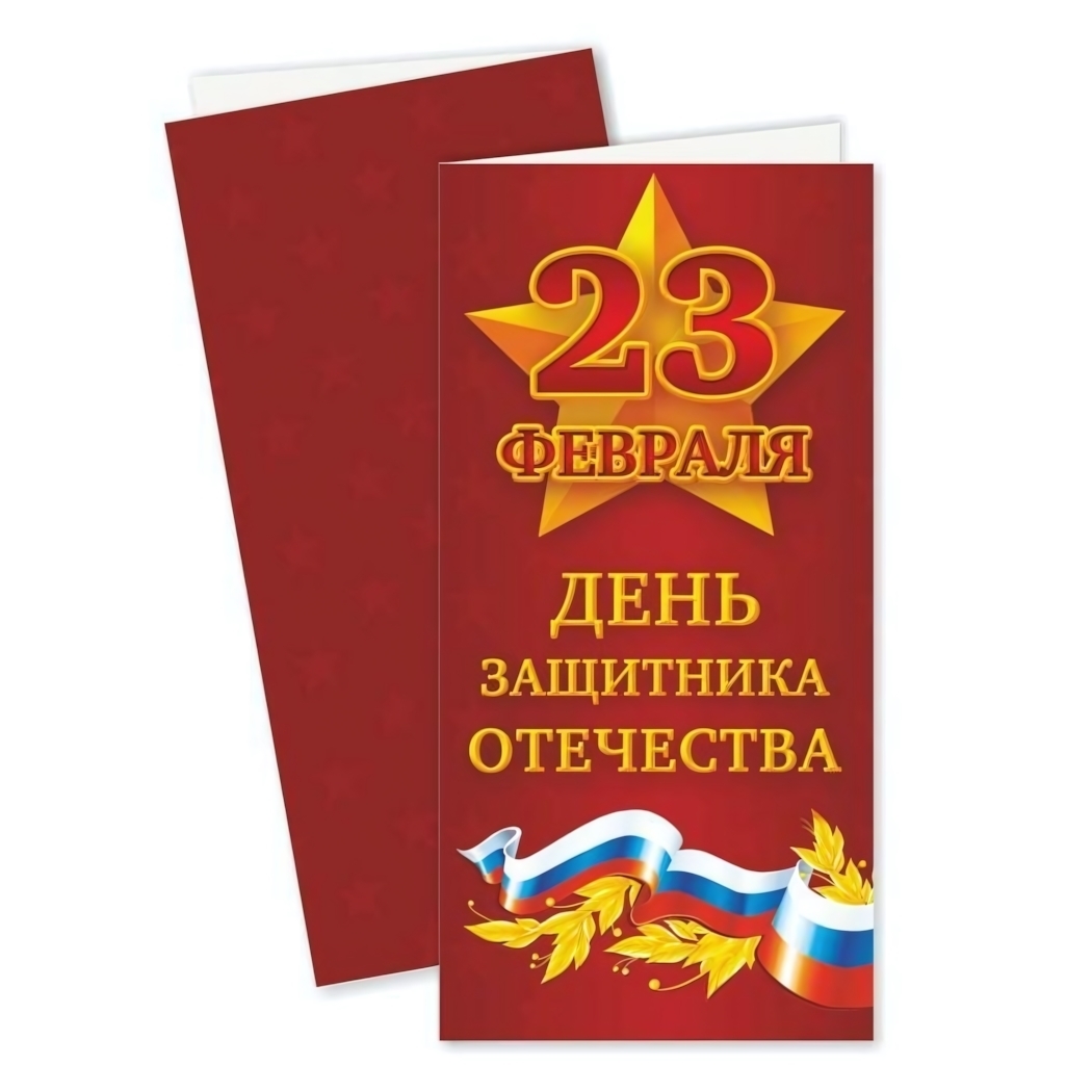 Подарите теплые слова и поздравления с Днем защитника Отечества, используя элегантную открытку евро стандарта. Стильный дизайн с красным фоном, золотой звездой и лавровыми ветвями создаст праздничное настроение.