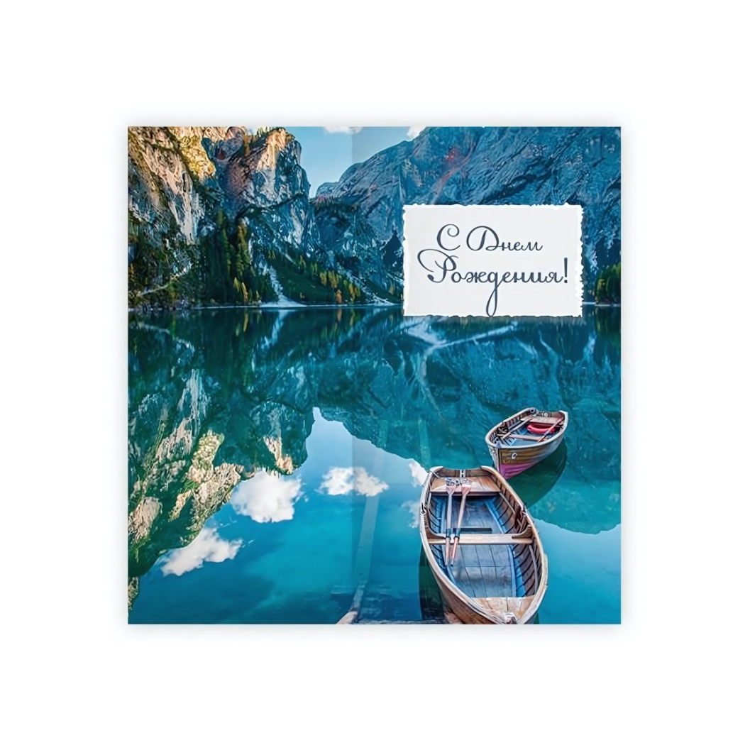 Открытка евро стандарт "С Днем Рождения! Природа", пейзаж с озером и лодками