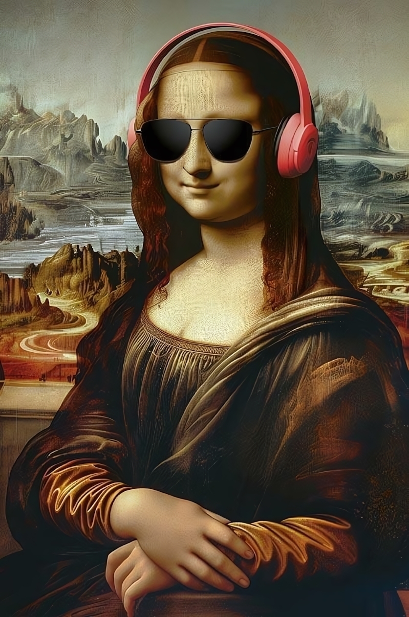 Открытка "Мона Лиза в наушниках", 105х156 мм, яркий дизайн, для поздравлений и подарков