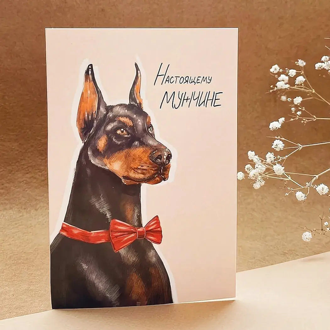 Почему стоит выбрать именно эту открытку? Во-первых, её уникальный дизайн с изображением добермана в красном бабочке привлечёт внимание и вызовет положительные эмоции. Во-вторых, текст «Настоящему мужчине» написан крупными буквами, что делает его легко читаемым и запоминающимся. Эта открытка станет не только красивым, но и значимым подарком.