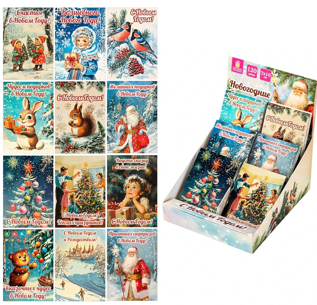 Размер: 7×10 см. Материал: плотный картон. Линия: «Золотая сказка». Отгружается одна открытка, в ассортименте 12 разных дизайнов. Пробуждает живое ощущение новогодних праздников.