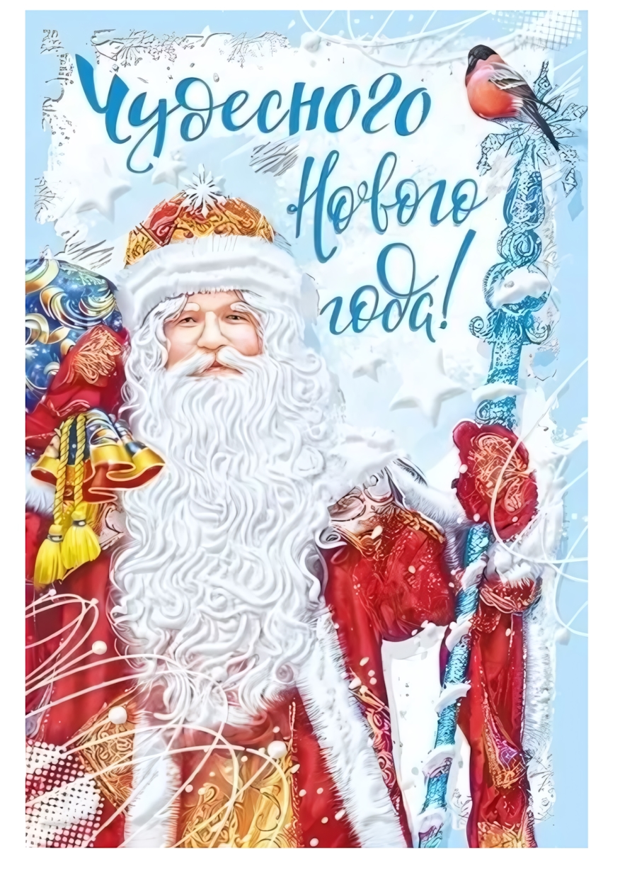 Эта изящная новогодняя открытка формата А5 создана для того, чтобы подарить особые эмоции и сделать поздравление незабываемым. На лицевой стороне изображён Дед Мороз в роскошной красной шубе с меховой отделкой, дополненной элементами синего и золотого цвета, на фоне нежных снежинок и зимних веточек. Яркий и стильный дизайн сразу погружает в праздничную атмосферу и вызывает улыбку у получателя.