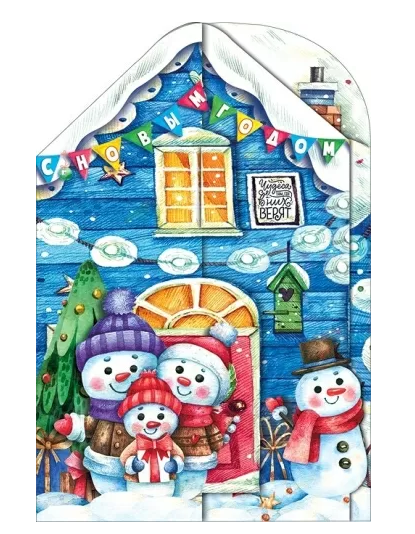 Эта яркая новогодняя открытка формата А5 наполнена теплом зимнего праздника. На ней изображён уютный домик, украшенный гирляндами, флажками, звёздами и венками, у которого весёлое семейство снеговиков встречает гостей. Яркие детали и насыщенные цвета создают атмосферу радости и ожидания чуда, делая этот подарок особенно трогательным.