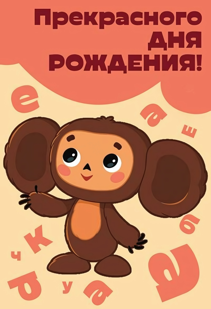 Подарите близким радость и улыбку с открыткой "Прекрасного дня рождения!", украшенной милым Чебурашкой. Яркий дизайн и теплые пожелания создадут атмосферу настоящего праздника.