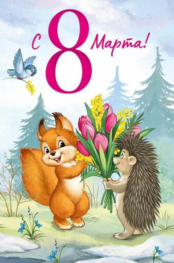 Почему стоит выбрать именно эту открытку? Во-первых, она выполнена в ярких цветах, что сразу привлекает внимание. На ней изображены милые мультяшные персонажи — белка и ежик, которые держат букеты цветов. Это создает атмосферу радости и веселья. Во-вторых, текст на открытке 'С 8 Марта!' написан крупным розовым шрифтом, что делает его легко читаемым и заметным. В-третьих, открытка изготовлена из качественного материала, что гарантирует ее долговечность и сохранность.
