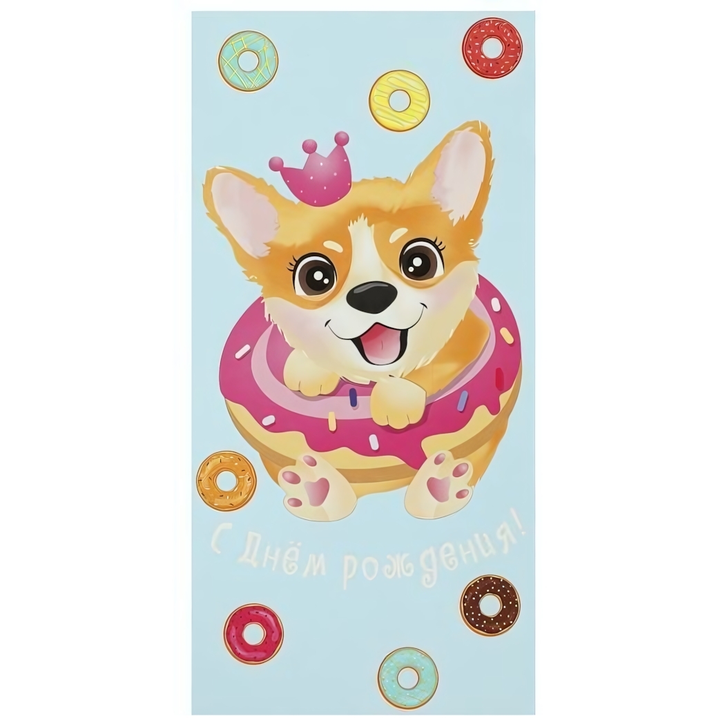 Подарите радость и улыбку с этой очаровательной открыткой, на которой изображен милый корги в сладком пончике! Эта открытка станет прекрасным дополнением к любому подарку и подарит незабываемые эмоции имениннику.