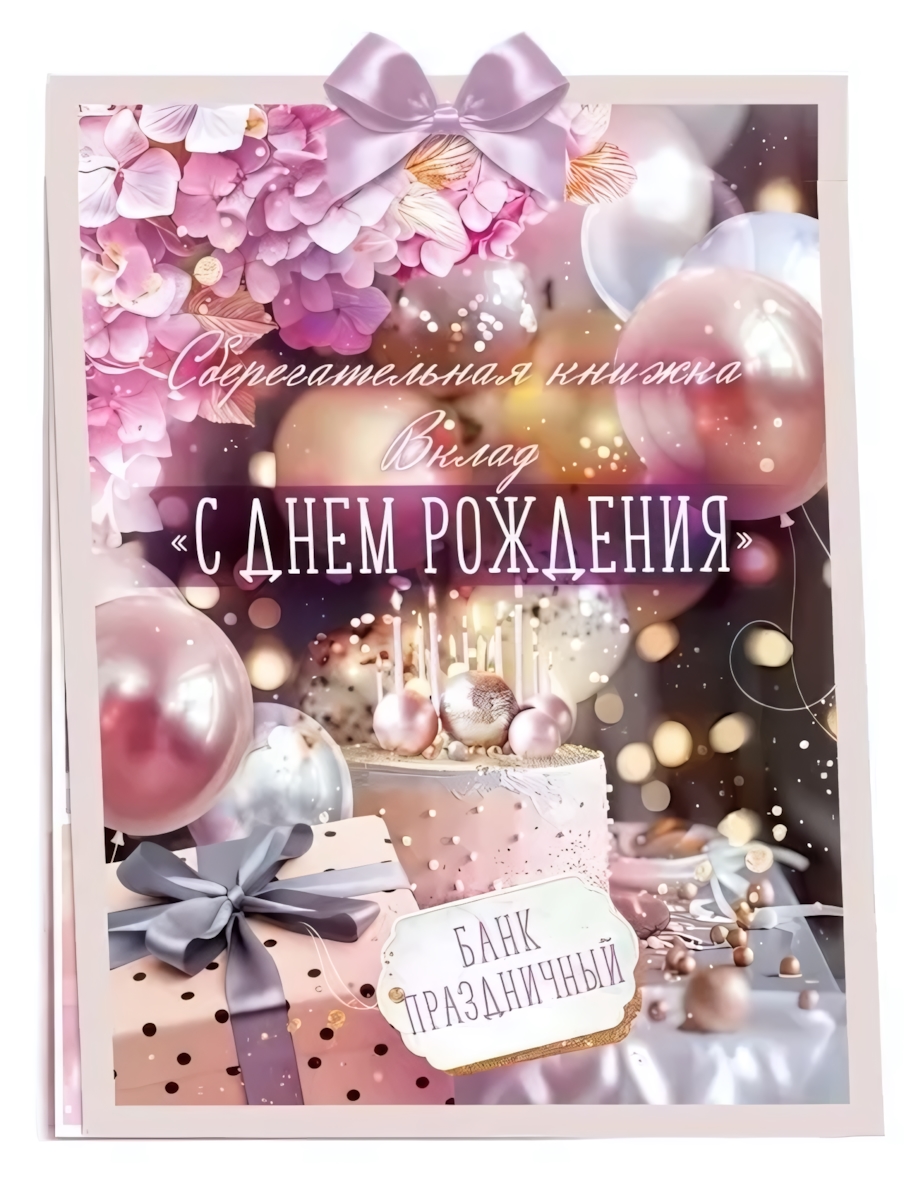 Эта необычная открытка станет идеальным дополнением к денежному подарку на день рождения. Она выполнена в виде стилизованной сберегательной книжки, что делает вручение денег оригинальным, значимым и очень личным событием. Яркий праздничный дизайн в розово-сиреневой гамме с золотистыми акцентами сразу создает нужное настроение.