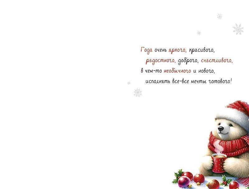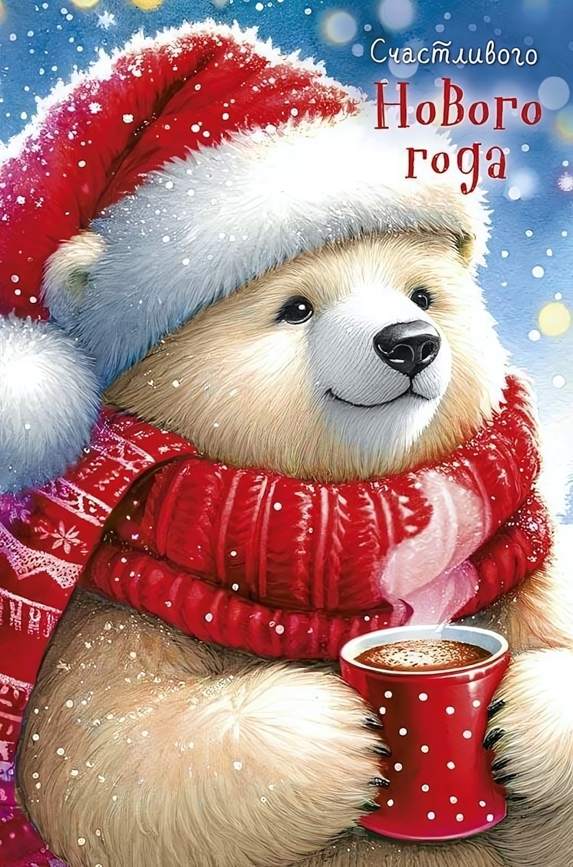 Создайте атмосферу волшебства и уюта с нашей очаровательной открыткой "Счастливого Нового Года". Милый медвежонок с кружкой горячего напитка согреет сердца ваших близких и подарит им праздничное настроение.