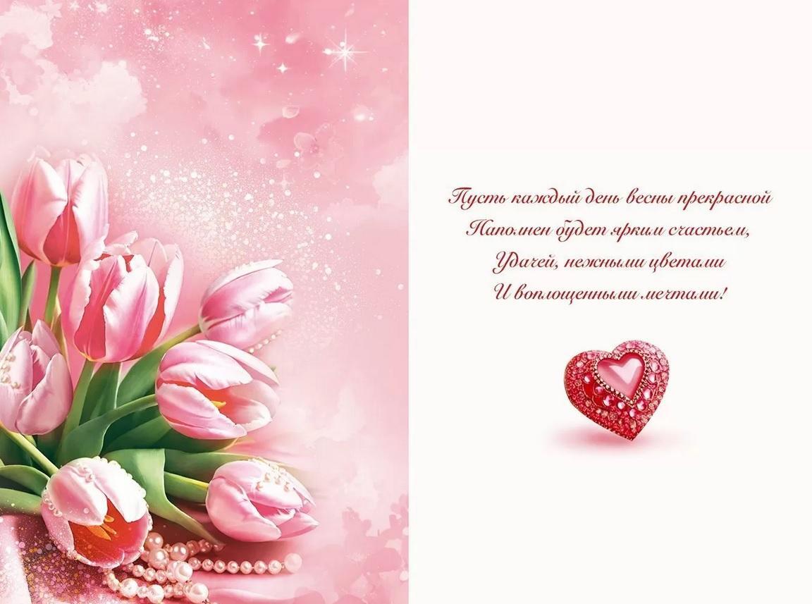 - Эмоциональный дизайн: Нежные розовые оттенки, изображение тюльпанов и декоративные элементы создают атмосферу праздника и весны.