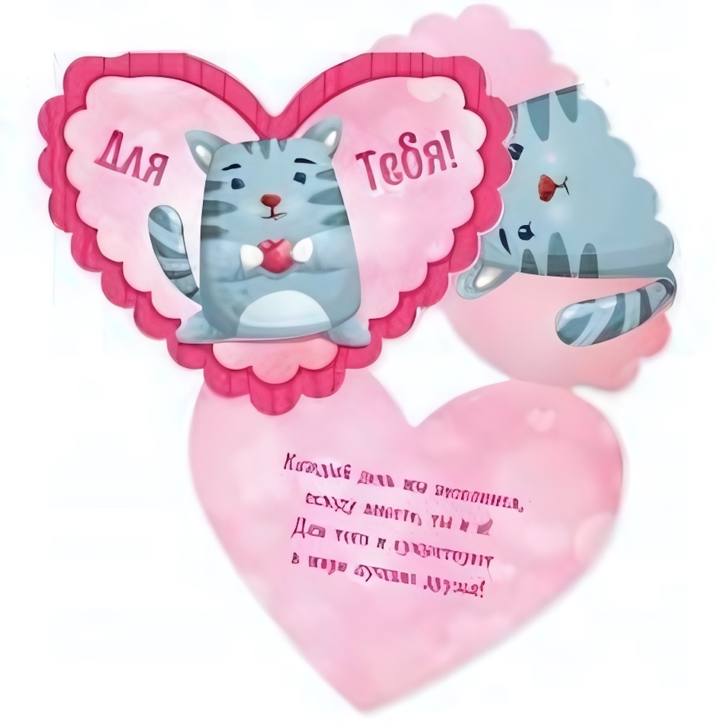 Двойное сердце из плотной бумаги с милым котом и готовой надписью «Для тебя» — идеальный способ выразить чувства без слов. Нежная комбинация розовых и голубых оттенков создаёт атмосферу романтики, а оригинальный дизайн выделит ваш подарок среди других.