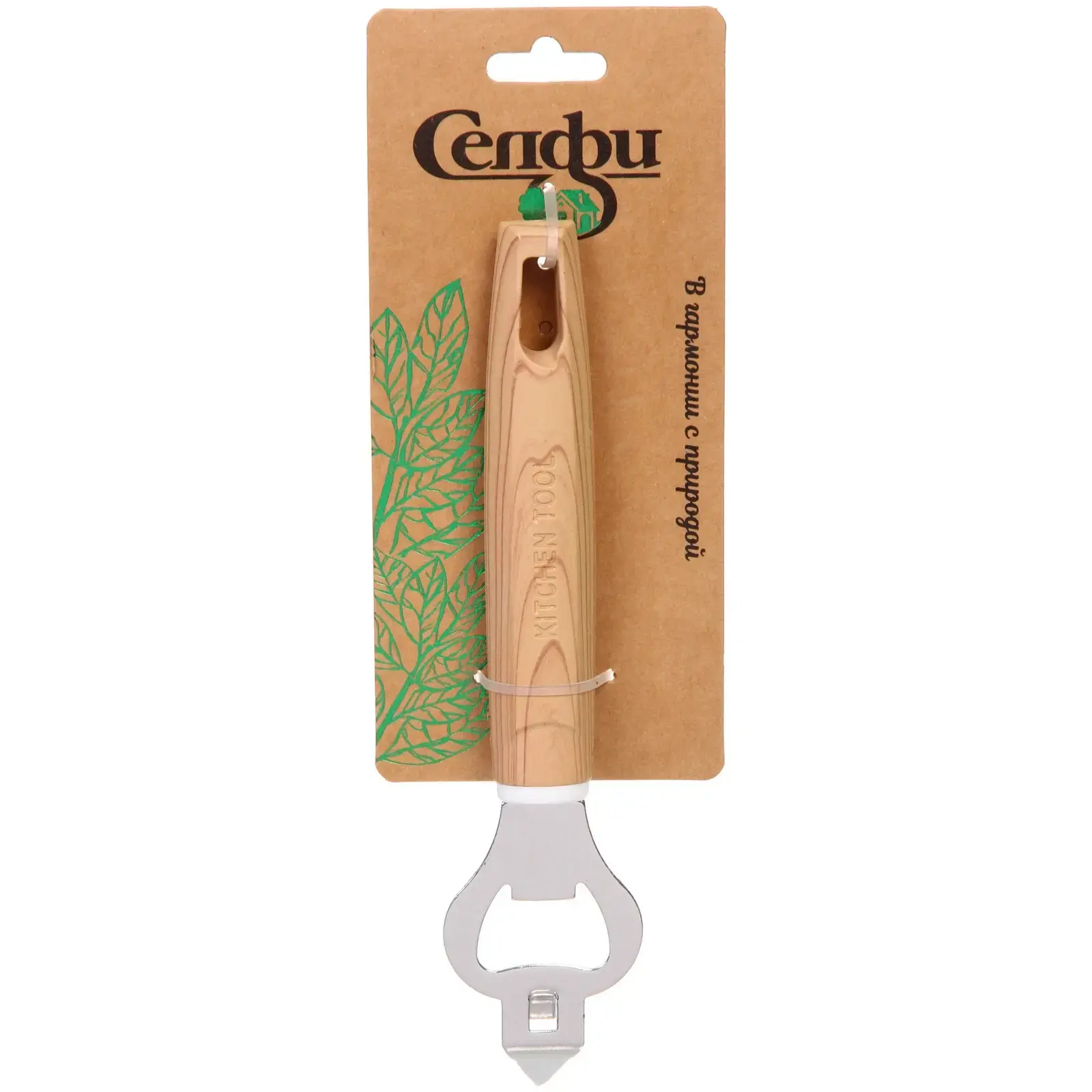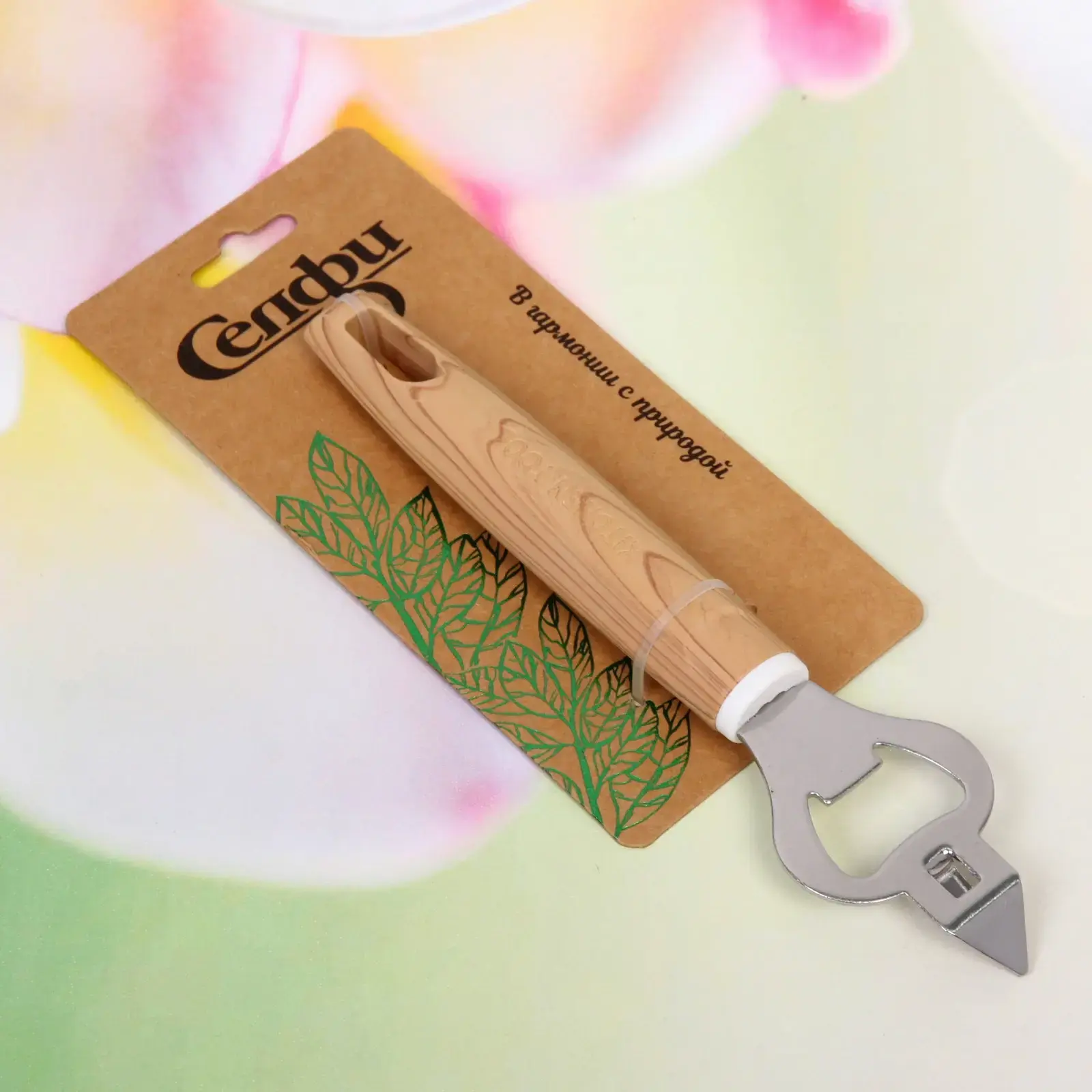 Открывалка имеет классическую форму с фигурным вырезом для удобного открывания крышек. Размеры товара не указаны, но он достаточно компактен для хранения и транспортировки. Упаковка выполнена из картона с растительными узорами, что подчеркивает экологичность продукта. Открывалка также имеет зацеп для подвешивания, что позволяет удобно хранить её на кухне.
