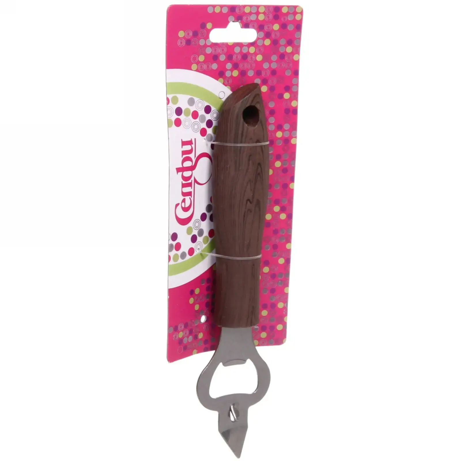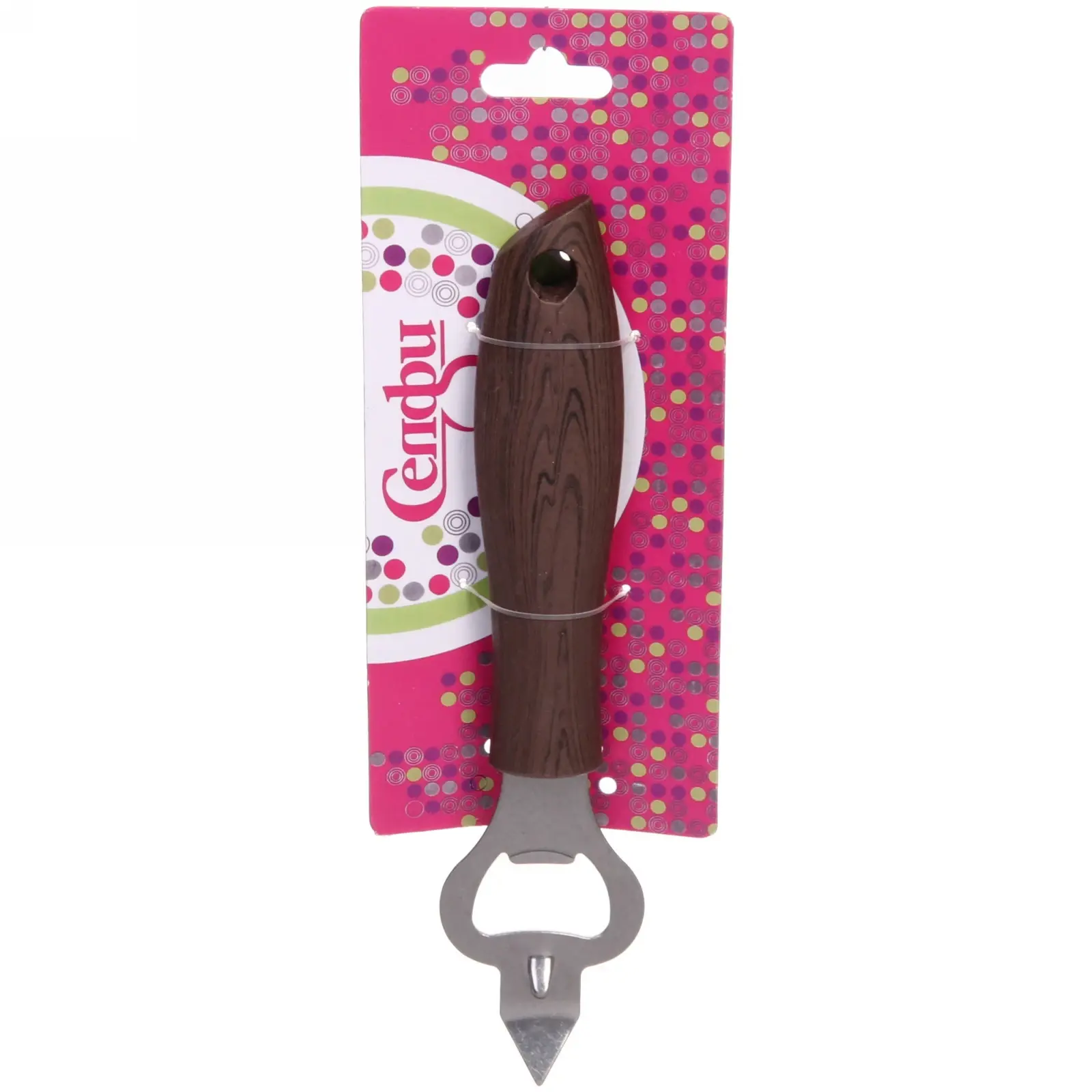 Открывалка выполнена из качественных материалов: металлическая часть из нержавеющей стали обеспечивает долговечность, а ручка из пластика с текстурой, напоминающей дерево, гарантирует надежный и удобный захват. У открывалки есть отверстие в верхней части ручки, что позволяет удобно подвешивать её на крючок, сохраняя порядок на кухне.