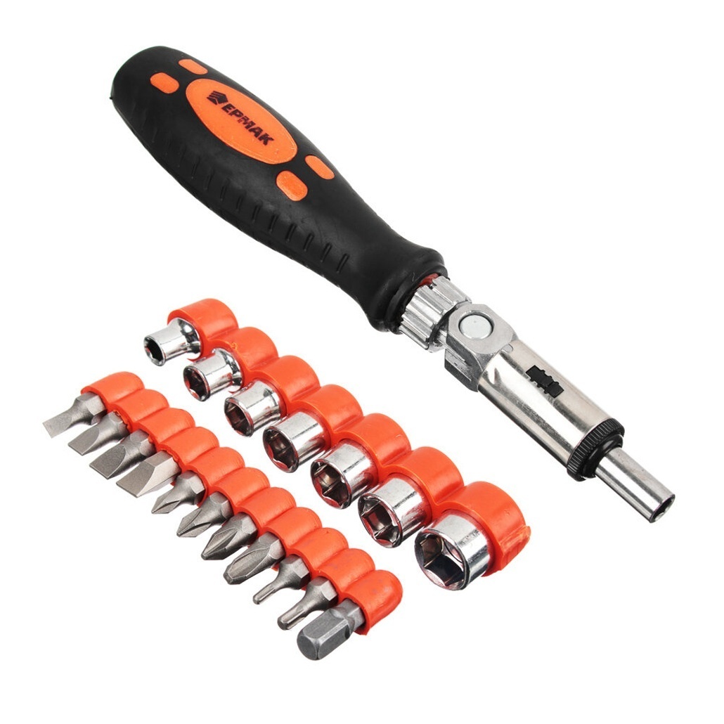 Универсальный комплект из 19 предметов обеспечит вас всем необходимым для бытового и профессионального использования. Эргономичная ручка с противоскользящим покрытием и реверсивный механизм делают работу комфортной даже в ограниченном пространстве.