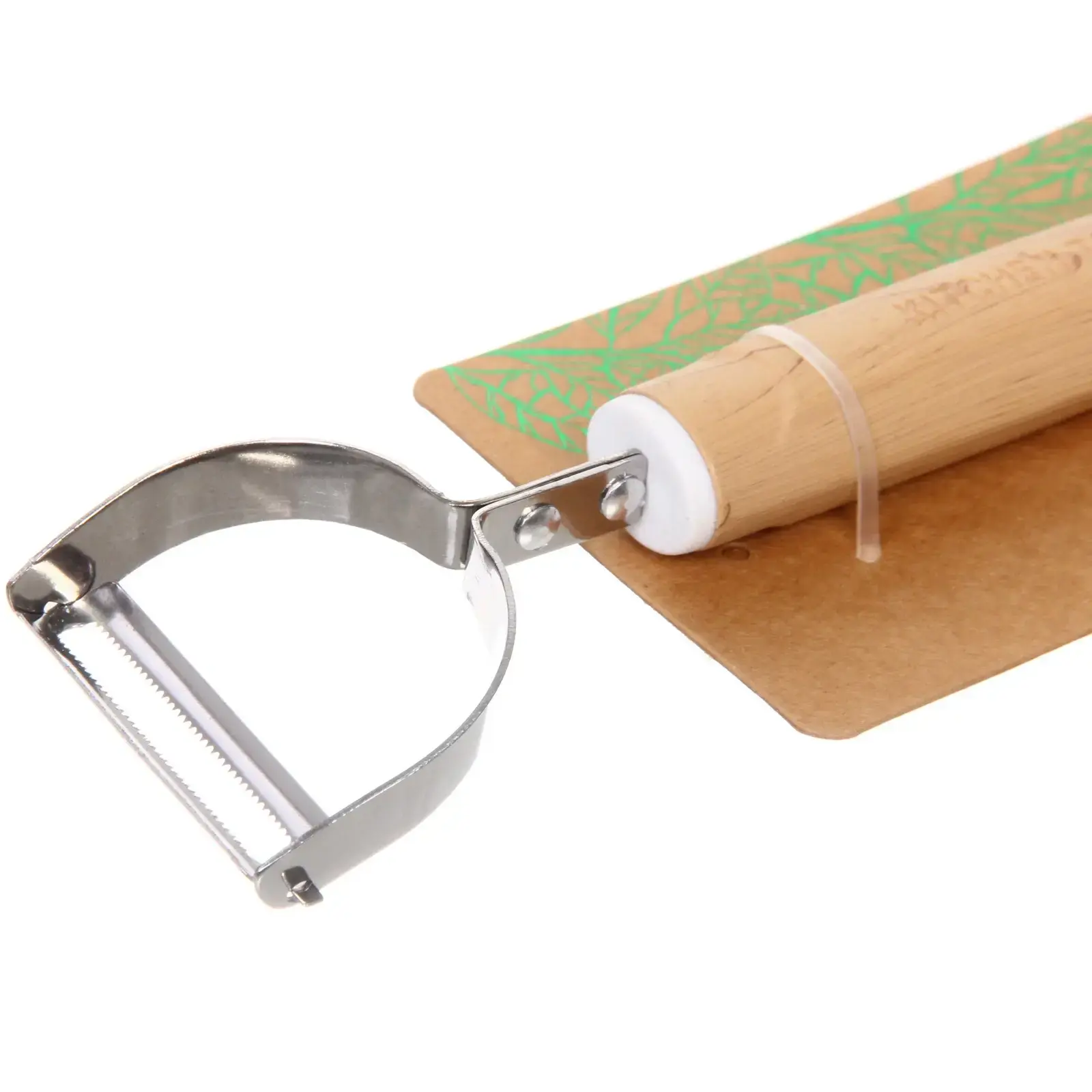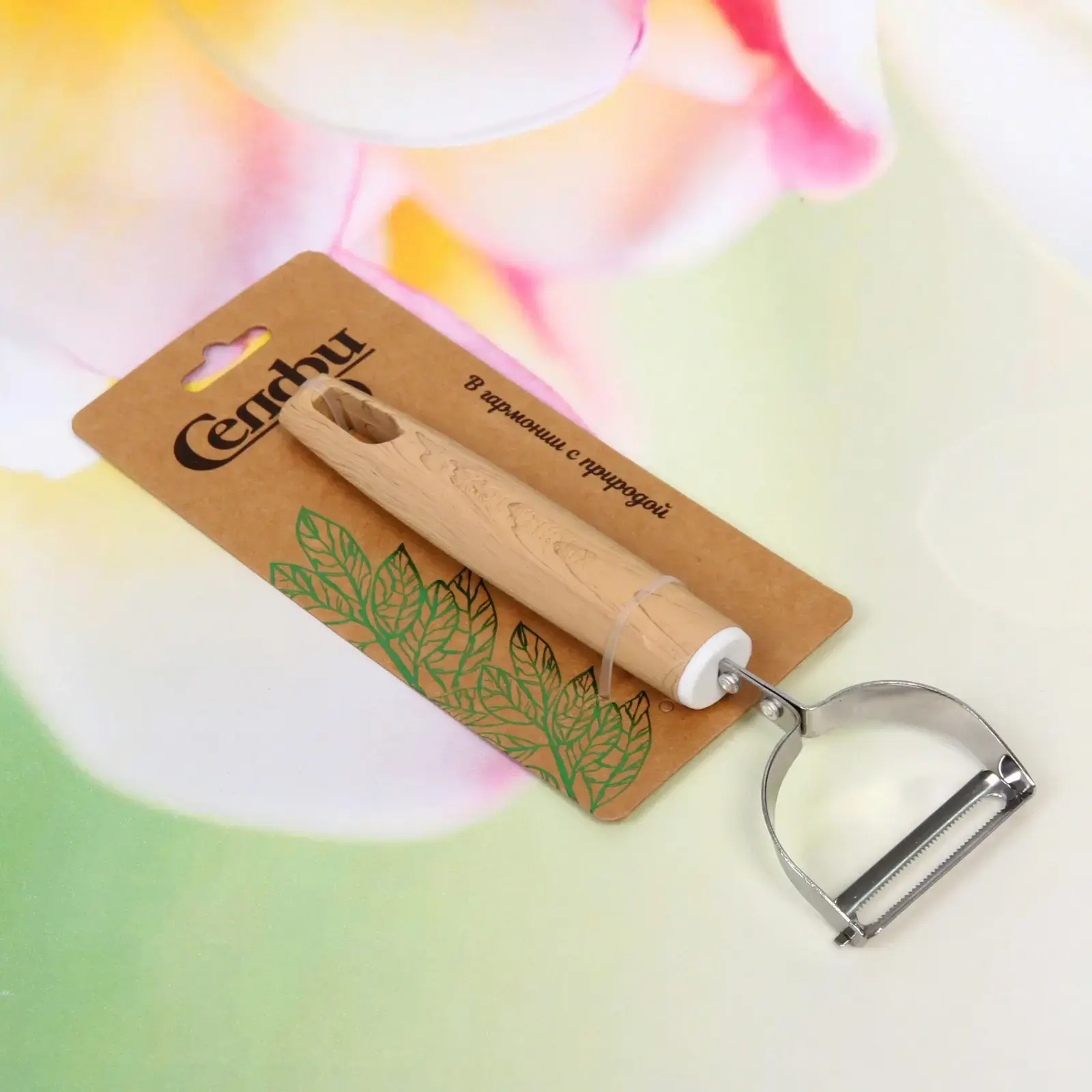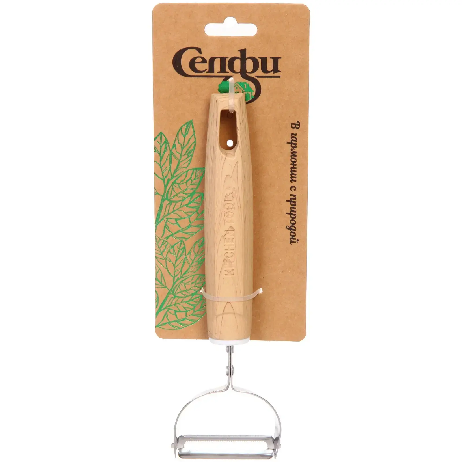 Овощечистка имеет стандартный размер, что делает ее удобной для хранения в кухонных ящиках. Материалы, из которых она изготовлена, обеспечивают долговечность и надежность в использовании. Упаковка оформлена в светлых тонах с изображением зеленых листьев, что подчеркивает экологическую направленность продукта.