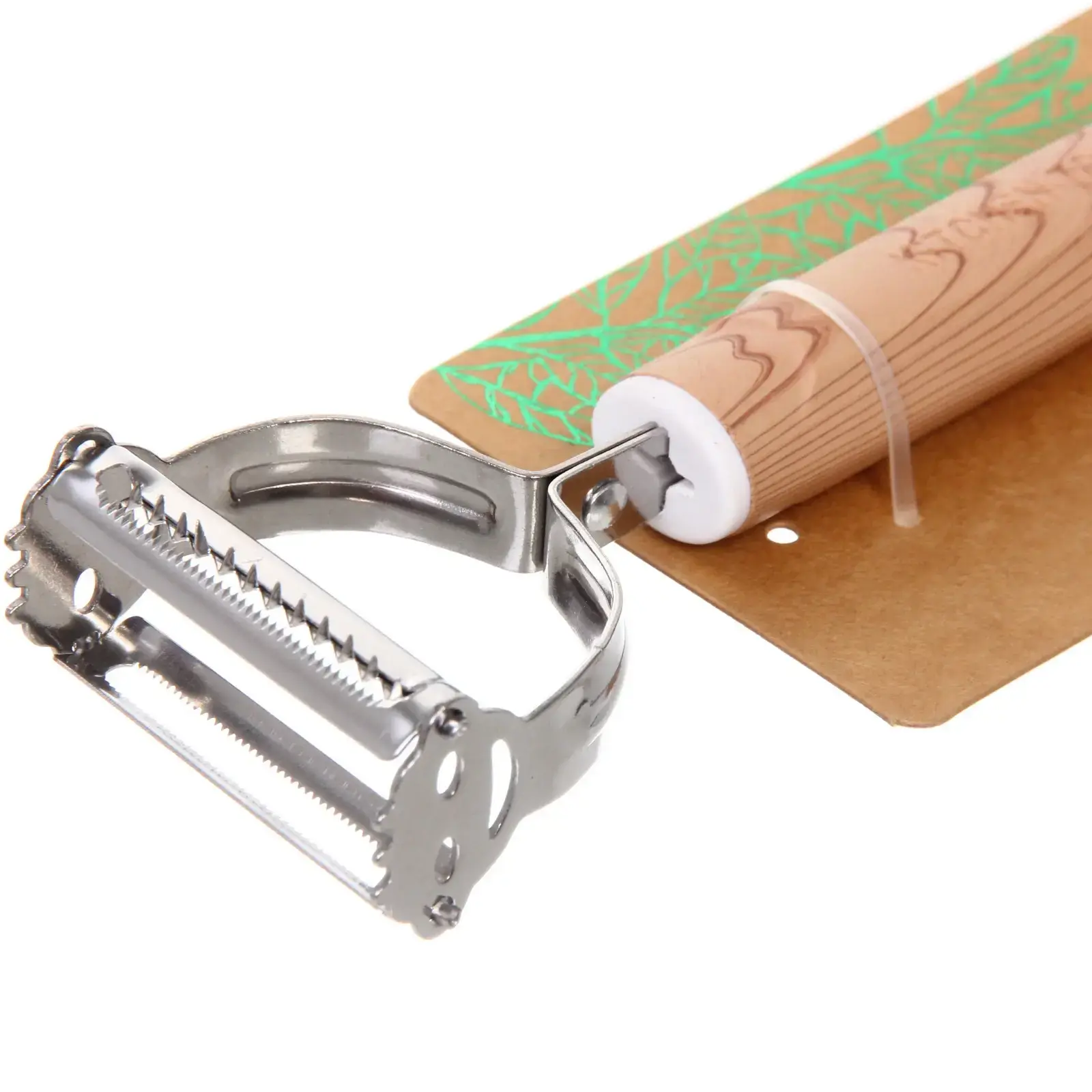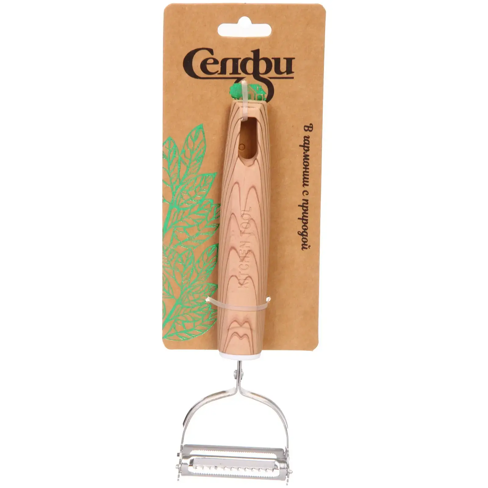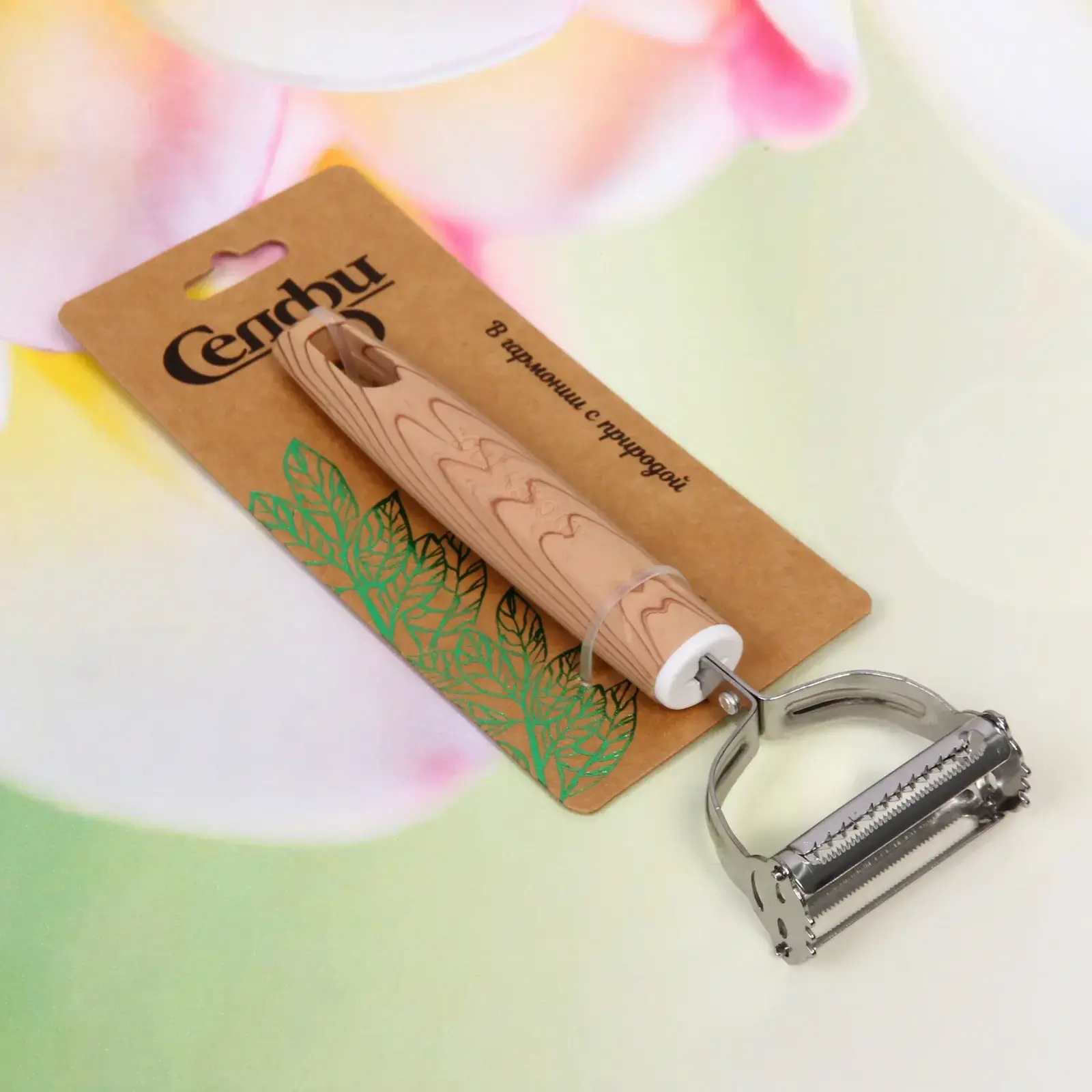 Овощечистка имеет стандартные размеры, что делает её удобной для хранения в любом кухонном ящике. Она легко моется и не требует особого ухода, что добавляет ей практичности. Упаковка оформлена в натуральных тонах, что подчеркивает её экологичность и гармонию с природой.