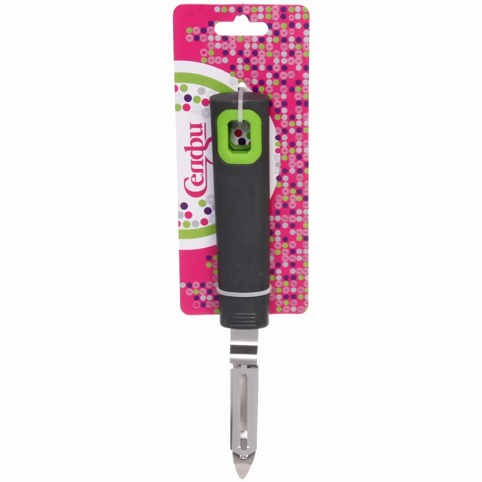 Ручка выполнена из пластика, чёрного цвета с зелёным акцентом или белой вставкой, а ребристая текстура гарантирует комфорт во время использования. Благодаря компактным размерам и лёгкости аксессуар занимает минимум места на кухне.