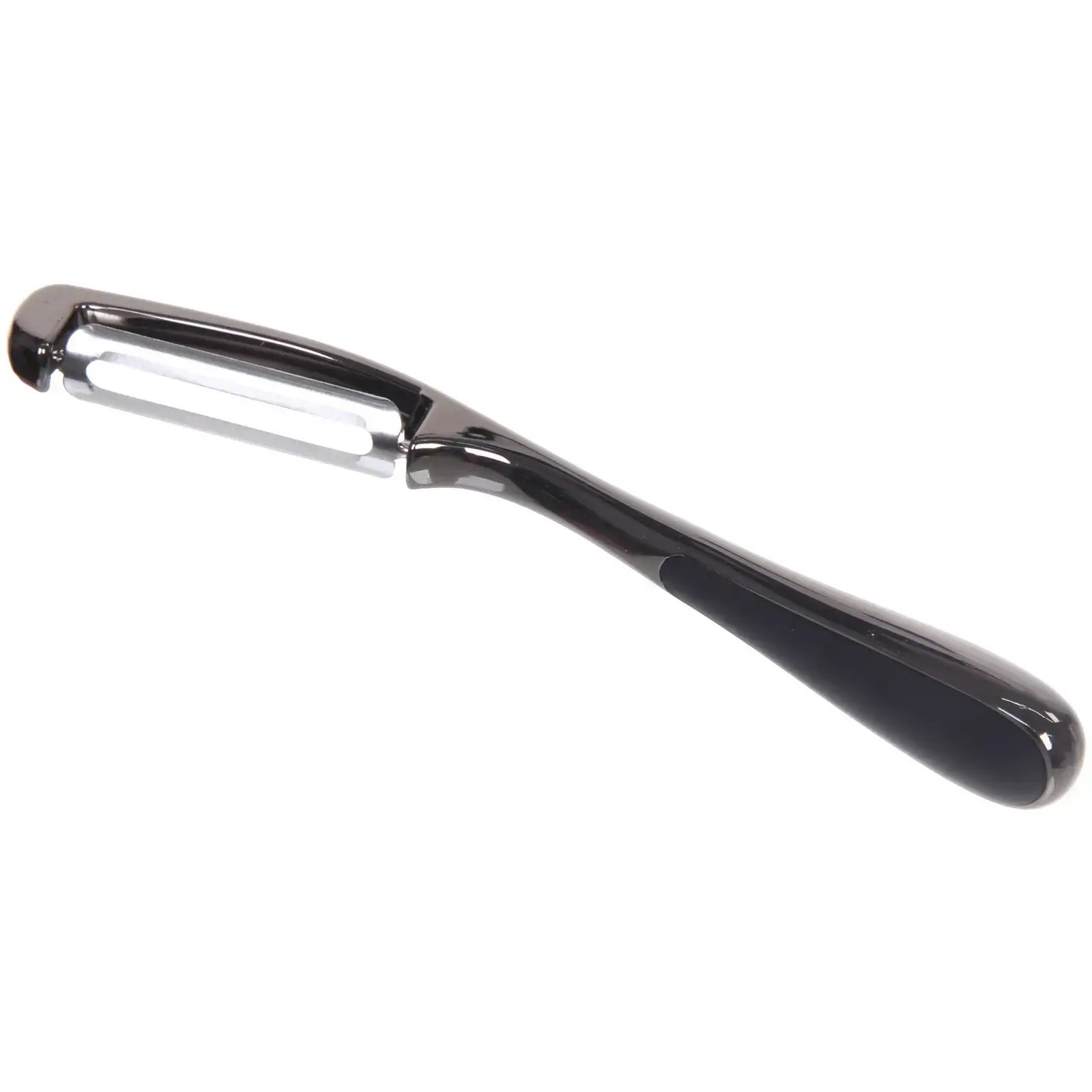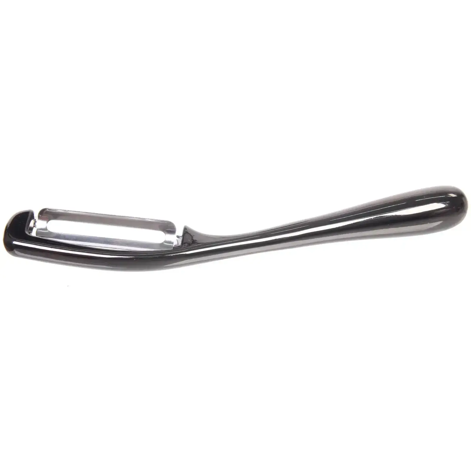 Овощечистка выполнена из качественных материалов: лезвие изготовлено из металла, а ручка — из прочного пластика. Длина овощечистки составляет примерно 20 см, что делает ее удобной для работы с различными продуктами. Черный цвет и гладкая поверхность придают ей стильный и современный вид, который отлично впишется в любую кухню.