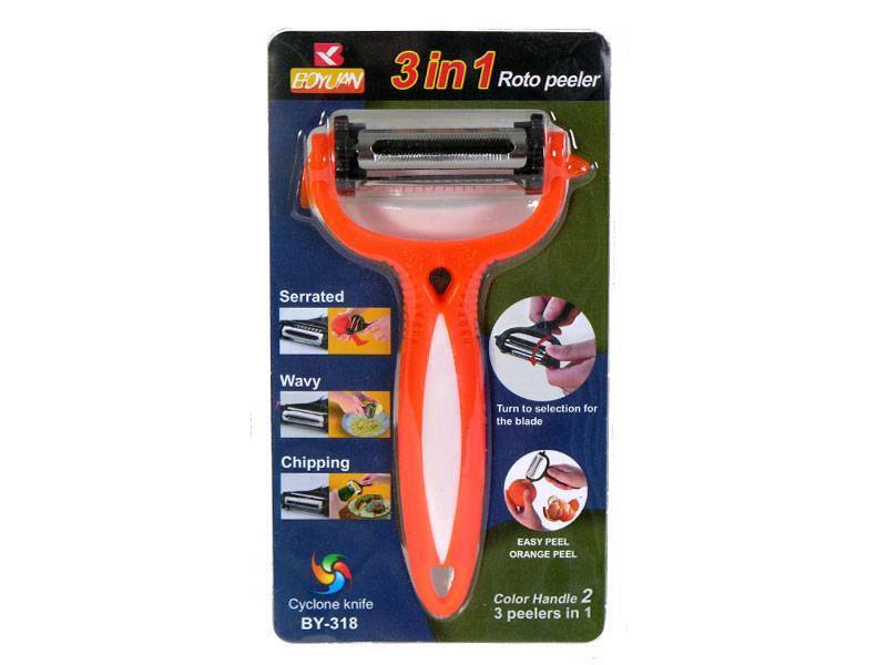 Представляем вам овощерезку-овощечистку 3 в 1, которая станет незаменимым помощником на вашей кухне. С её помощью вы сможете быстро и легко нарезать овощи, экономя время и усилия. Эргономичная ручка оранжевого цвета с белыми вставками обеспечивает комфортное использование, а три типа лезвий — зубчатое, волнистое и для чипсов — позволяют разнообразить ваши кулинарные шедевры.