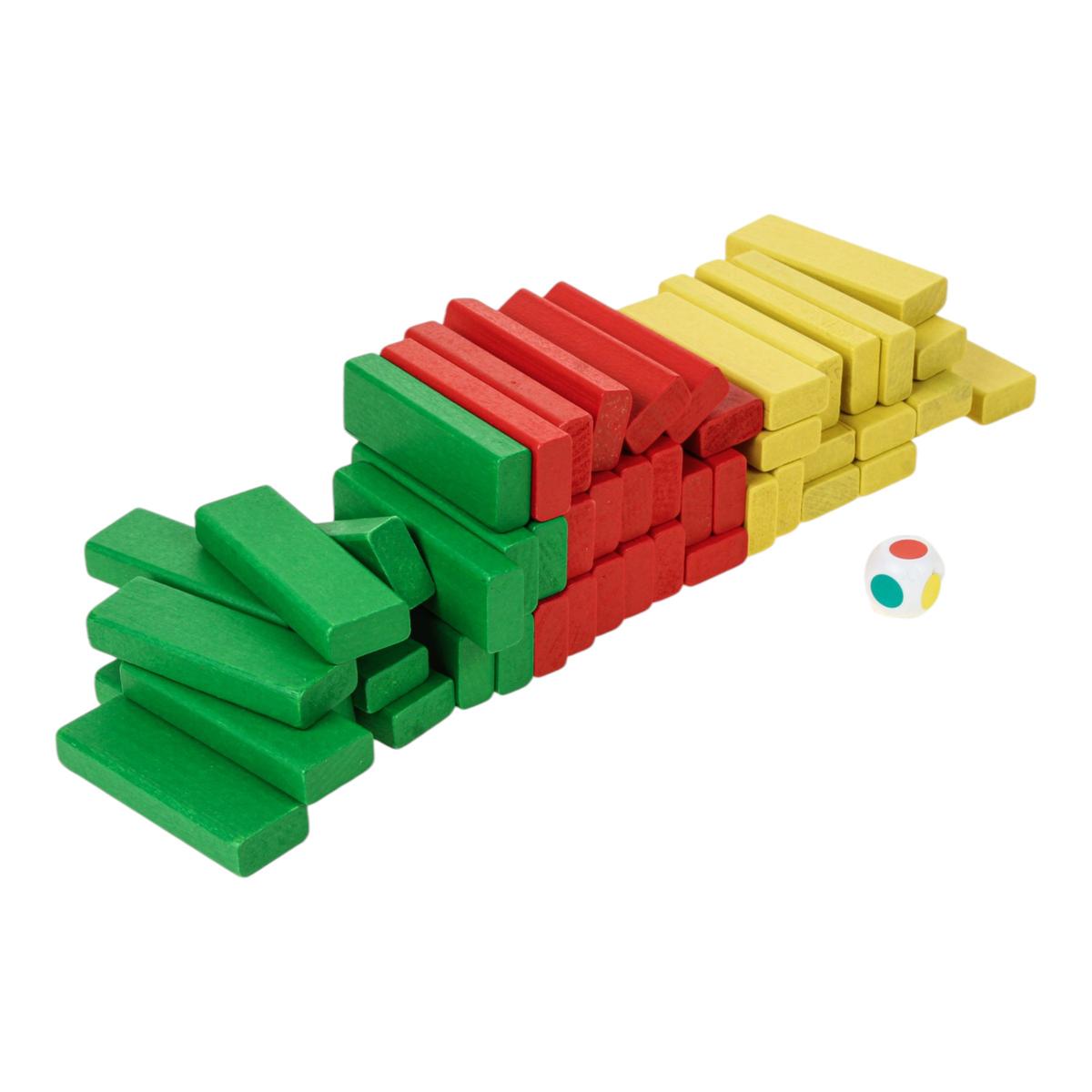 - Натуральные материалы: все 54 детали выполнены из качественного дерева. Бруски тщательно отшлифованы, имеют приятную текстуру и окрашены безопасными красками в яркие цвета: красный, желтый и зеленый.