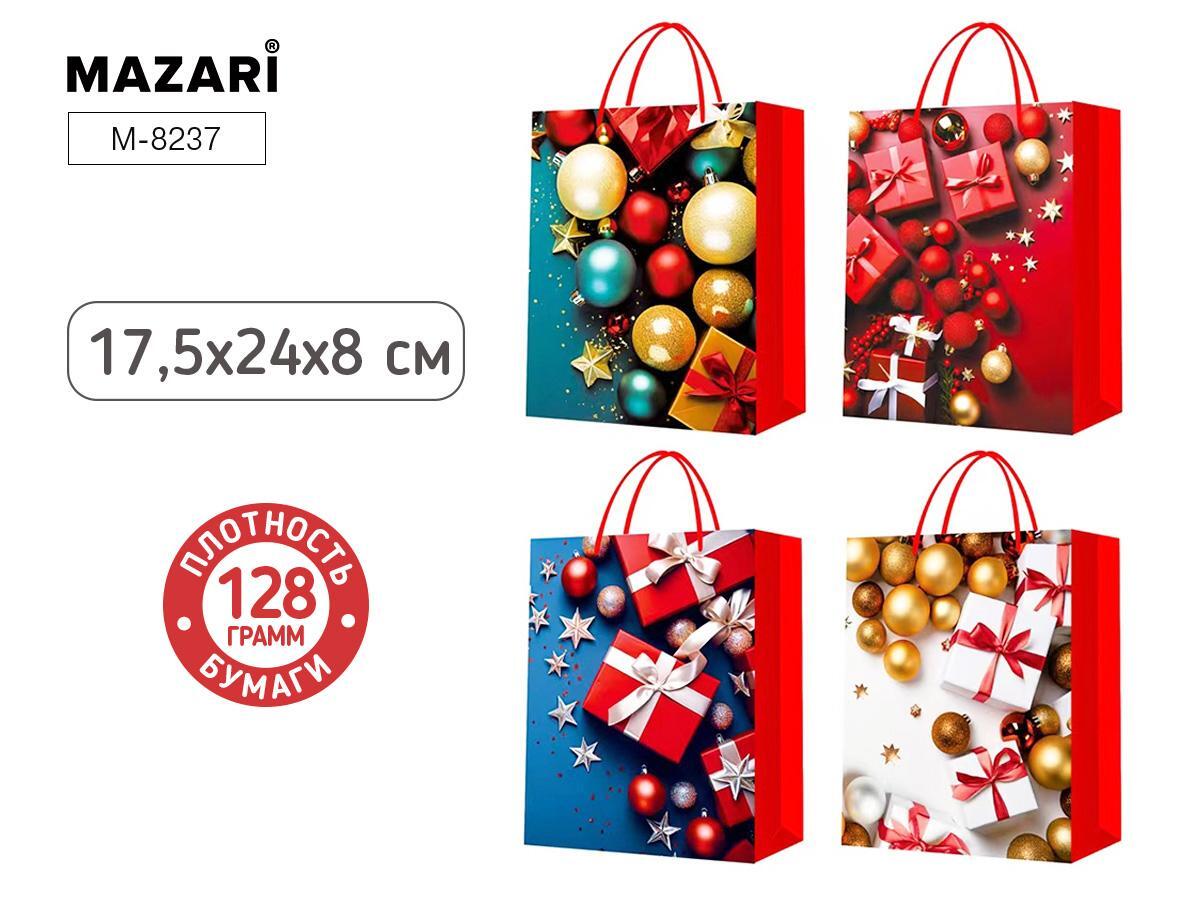 Размер: 17,5×24×8 см. Пакет выполнен из бумаги плотностью 128 г/м², что позволяет выдерживать вес небольших подарков. Каждый экземпляр оснащён парой прочных красных ручек. Цвет и дизайн пакета подбираются случайным образом при отправке (цвет в ассортименте).