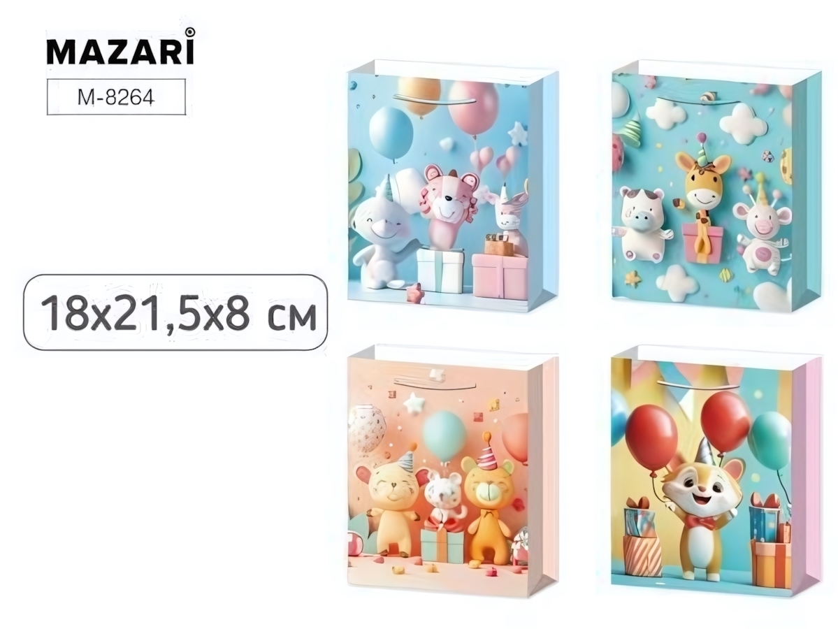 Яркий бумажный подарочный пакет создан, чтобы сделать момент вручения подарка ещё более запоминающимся. Милые изображения животных в праздничной атмосфере, воздушные шары, конфетти и подарки создают радостное настроение и привлекают внимание ребёнка с первого взгляда.