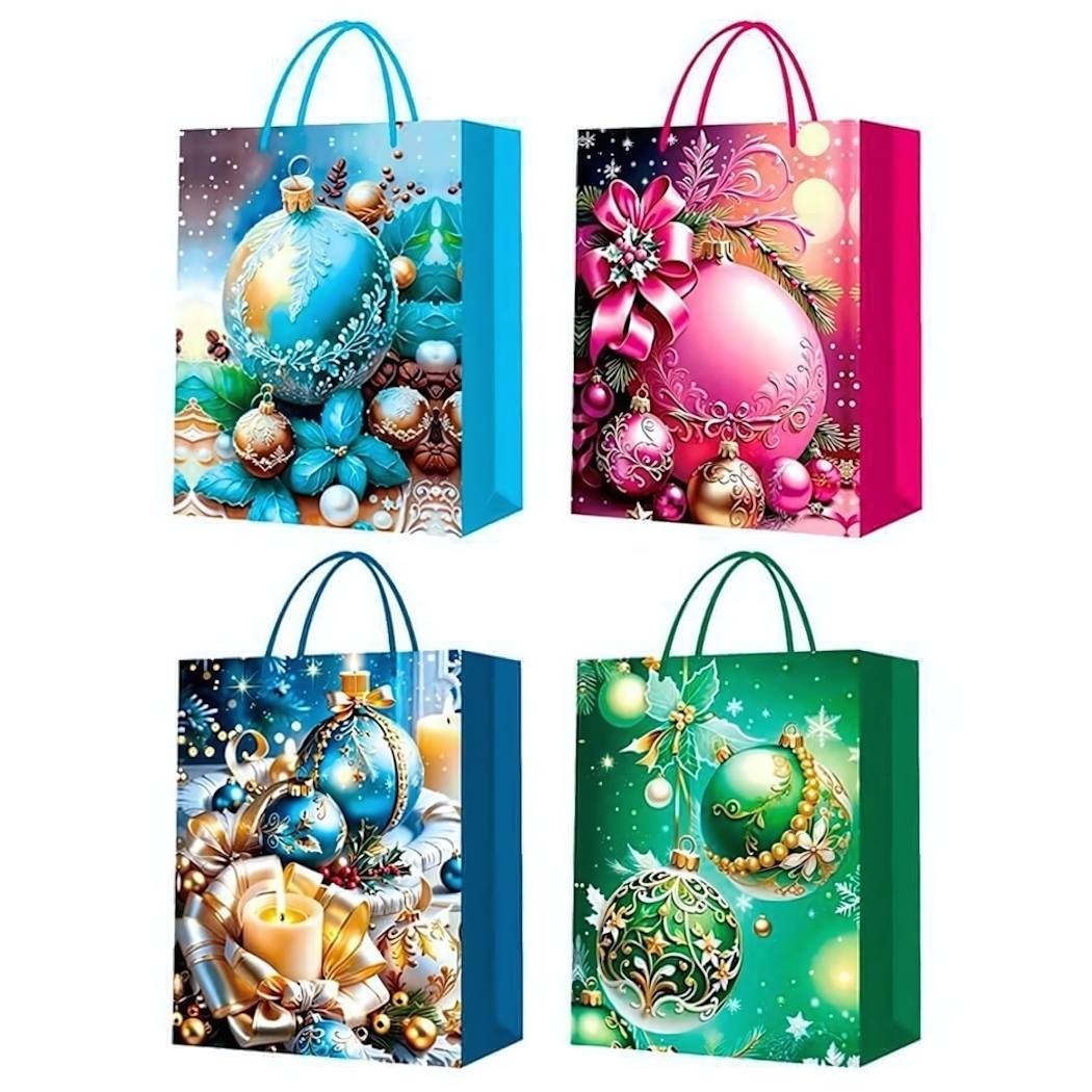 Что выделяет наши пакеты? Во-первых, это разнообразие дизайнов. Каждый пакет оформлен с использованием ярких цветов и уникальных рисунков, включая новогодние шары и праздничные элементы. Во-вторых, качество материала: пакеты сделаны из прочной бумаги с глянцевым покрытием, что обеспечивает им долговечность и красивый внешний вид.