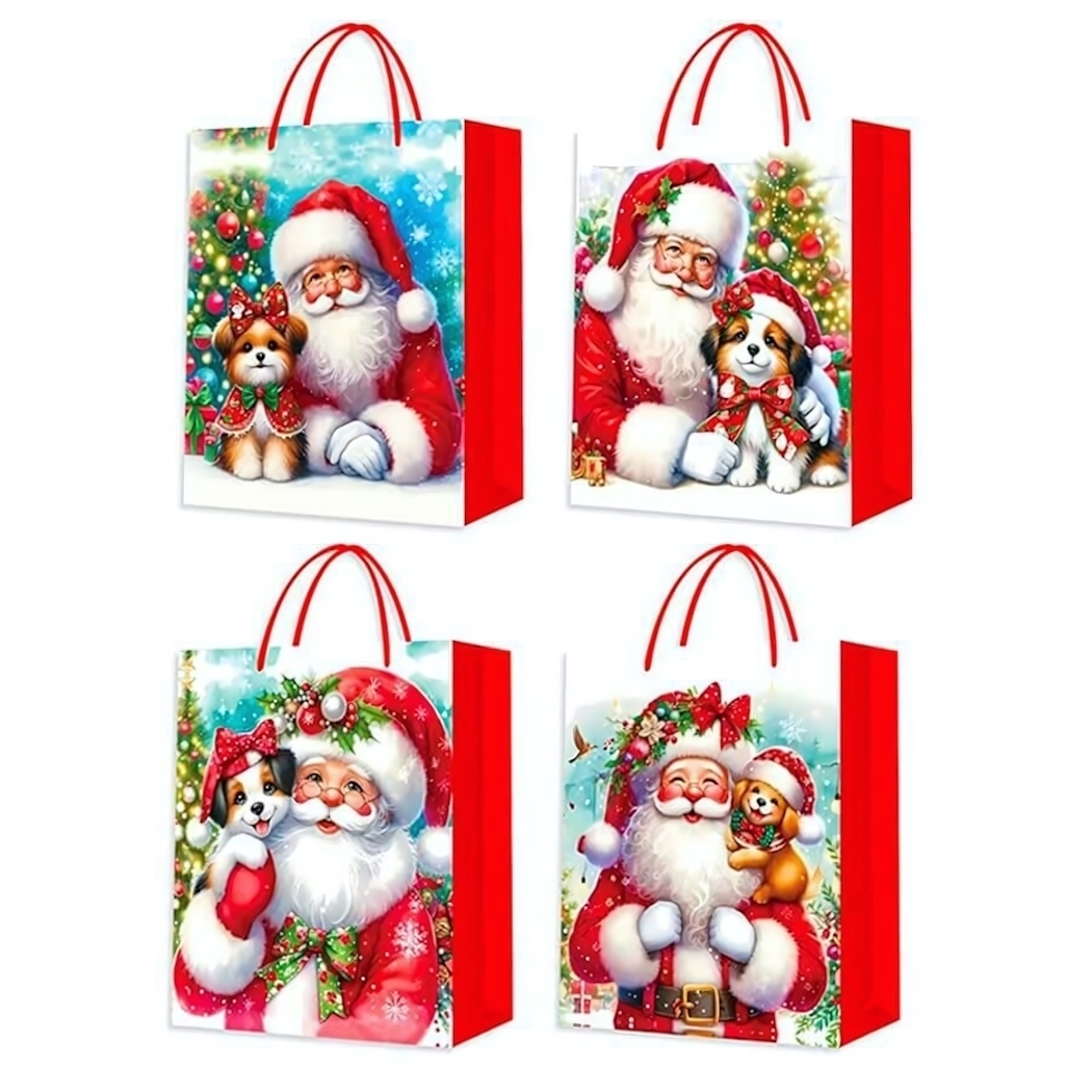 Пакет представлен в ассортименте из 4 ярких дизайнов с изображением Санта-Клауса и милых щенков. Отгружается один пакет, цвет и рисунок определяются случайным образом.